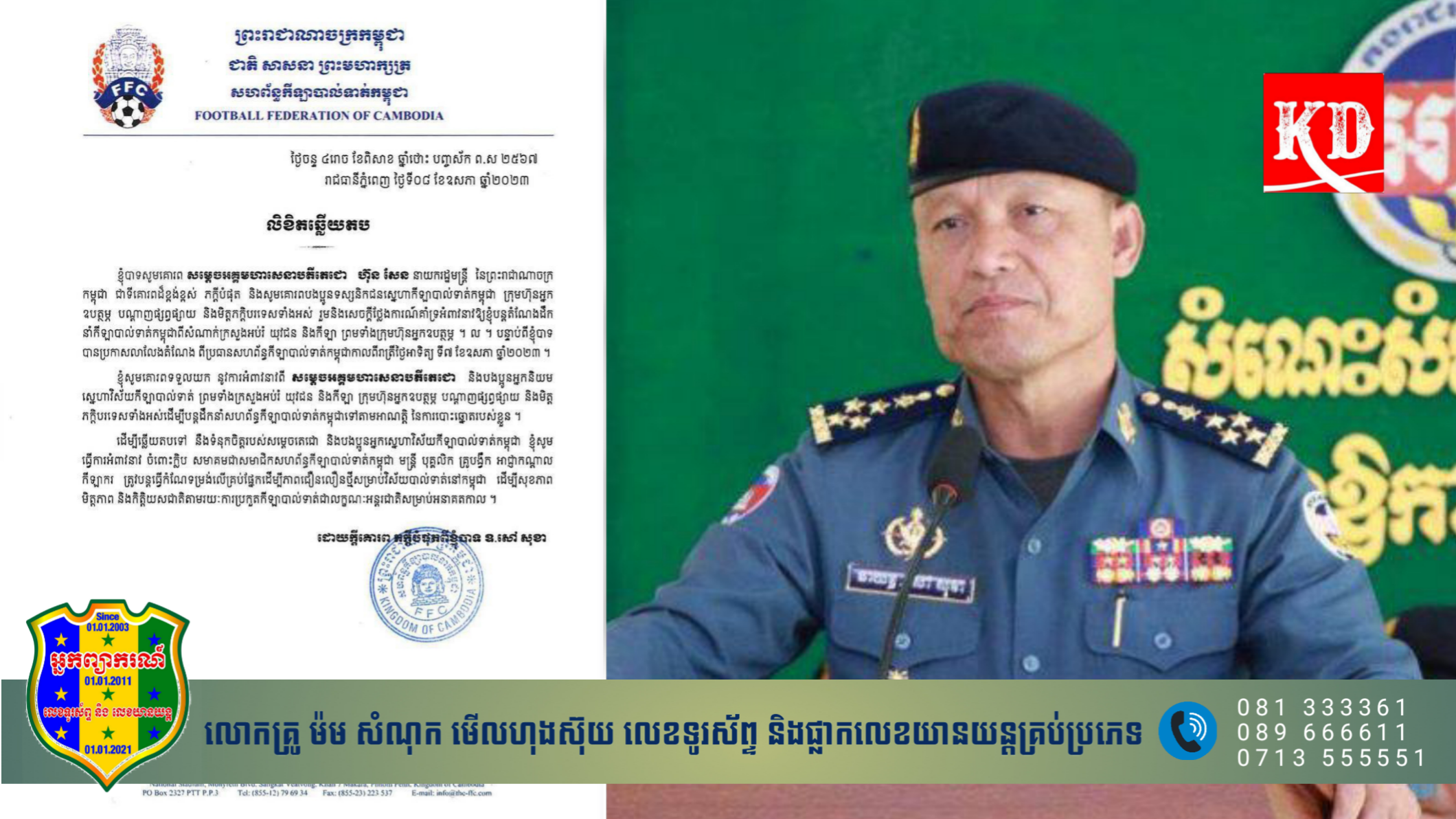 រាជធានីភ្នំពេញ៖ ដោយក្ដីគោរពទៅតាមការសំណូមពររបស់ សម្ដេចតេជោ ហ៊ុន សែន ឯកឧត្តម នាយករដ្ឋមន្ត្រី នៃព្រះរាជាណាចក្រកម្ពុជា ពេលនេះឯកឧត្តមនាយឧត្តមសេនីយ៍ សៅ សុខា នឹងបន្ដធ្វើជាប្រធានសហព័ន្ធកីឡាបាល់ទាត់កម្ពុជា។ នេះបើយោងតាម“លិខិតឆ្លើយតប”របស់សហព័ន្ធកីឡាបាល់ទាត់កម្ពុជា ដែលចេញដោយ ឯកឧត្តមនាយឧត្ដមសេនីយ៍ សៅ សុខា ផ្ទាល់ នៅរសៀលថ្ងៃទី០៨ ខែឧសភា ឆ្នាំ២០២៣នេះផងដែរ។