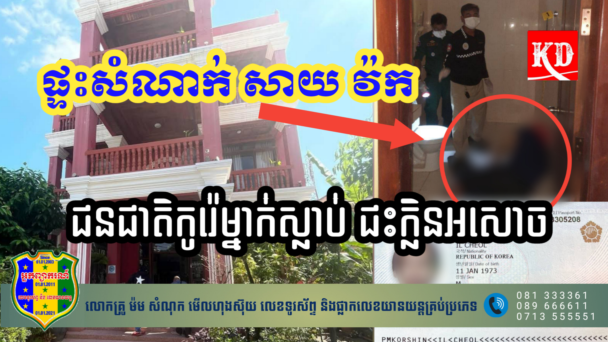 សមត្ថកិច្ចថា សពជនជាតិកូរ៉េដែលស្លាប់នោះ មានឈ្មោះ SHIN IL CHEOL ភេទប្រុស អាយុ ៥០ឆ្នាំ មុខរបរគ្មាន កំពស់ 1.70 មែត្រ កាន់លិខិតឆ្លងដែនលេខ M93305208 ស្នាក់នៅកន្លែងកើតហេតុខាងលើ។