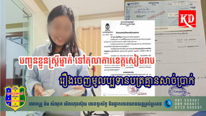 ខេត្តសៀមរាប៖ កាលពីថ្ងៃទី ១៦ ខែឧសភា ឆ្នាំ ២០២៣ សមត្ថកិច្ចបានបញ្ជូនខ្លួនស្ត្រីម្នាក់ ឈ្មោះ ញាណ សំបូរ អាយុ ៣៦ឆ្នាំ មុខរបរ រកស៊ី បច្ចុប្បន្នស្នាក់នៅភូមិវាល សង្កាត់គោកចក ក្រុងសៀមរាប ទៅតុលាការខេត្តសៀមរាប ដើម្បីស៊ើបសួរបន្តរឿងចេញមូលប្បទានបត្រគ្មានសាច់ប្រាក់។
