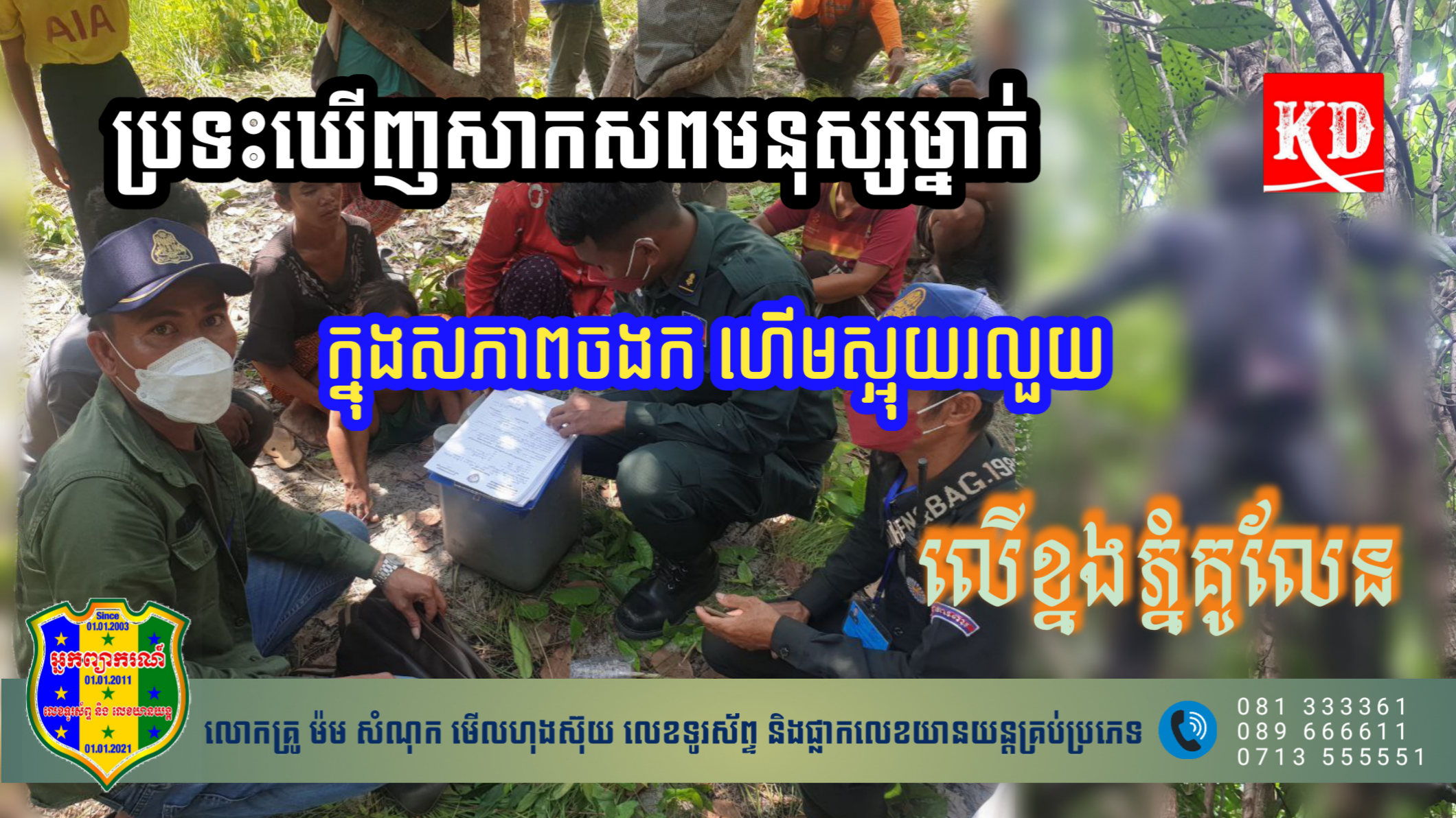 ខេត្តសៀមរាប៖ ប្រទះឃើញសាកសពមនុស្សម្នាក់ ក្នុងសភាពចងក ហើមស្អុយរលួយ ត្រង់ចំណុចទឹកធ្លាក់ល្បើក(ភ្នំគូលែន) ស្ថិតក្នុងភូមិសង្កែរឡាក់ ឃុំខ្នងភ្នំ ស្រុកស្វាយលើ ខេត្តសៀមរាប កាលពីវេលាម៉ោង ១១ និង២៥ នាទីថ្ងៃទី១៩ ខែ ឧសភា ឆ្នាំ២០២៣។