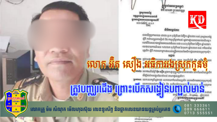 ខេត្តរតនគិរី៖ អធិការរងស្រុកកូនមុំ លោក អ៊ិត សឿង ដែលបើកសង្វៀនបញ្ជល់មាន់ ពេលនេះត្រូវដកបញ្ឈរជើងបណ្ដោះអាសន្នហើយ។ នេះបើយោងតាមលិខិតបង្គាប់ការ របស់ស្នងការដ្ឋាននគរបាលខេត្តរតនគិរី ដែលអង្គភាពសារព័ត៌មាន គូលែនដេលី ទទួលបាន កាលពីរសៀលថ្ងៃទី២៤ ខែឧសភា ឆ្នាំ២០២៣នេះ។
