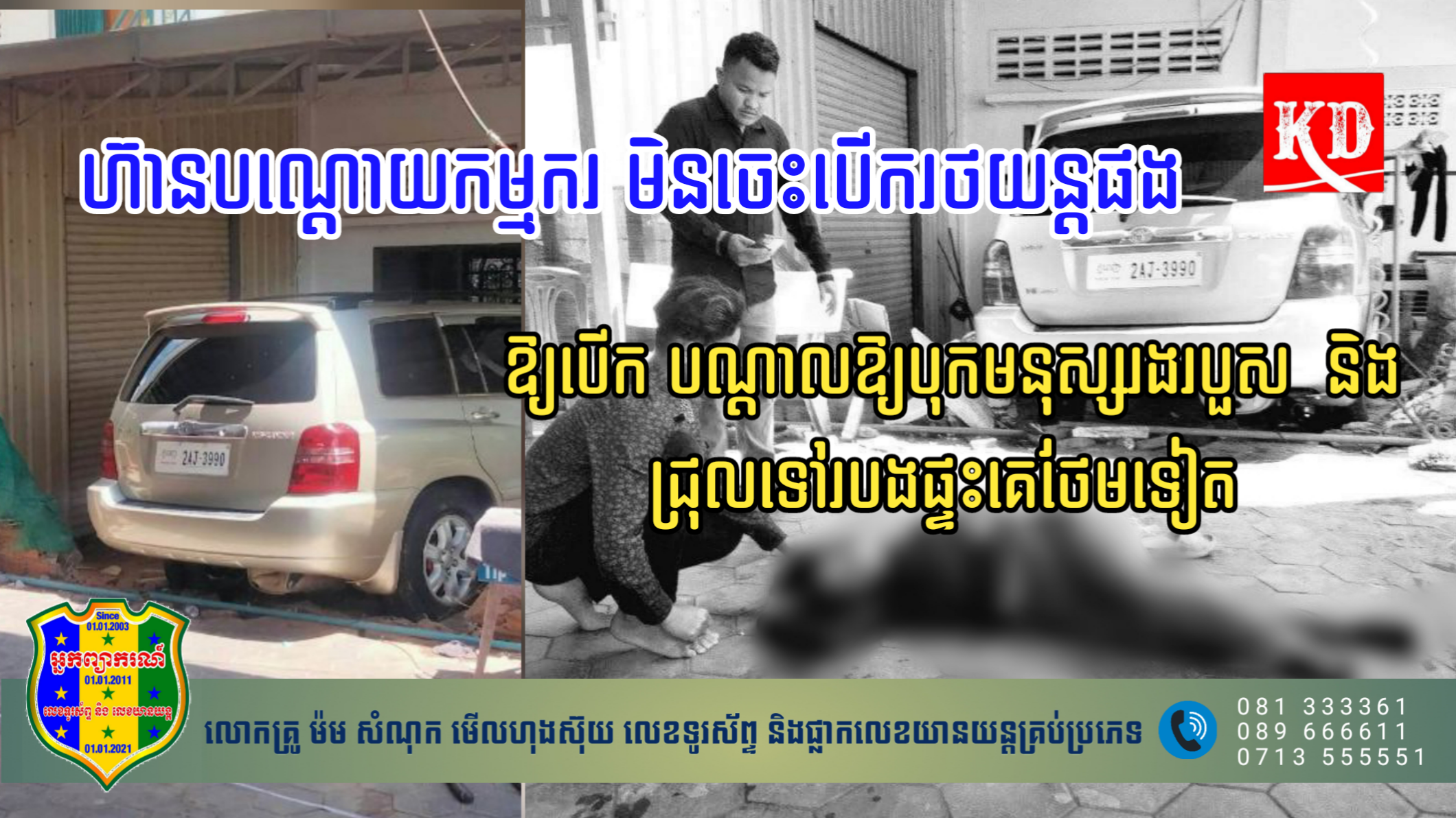 ខេត្តសៀមរាប៖ កន្លែងលាងឡាន យីហោ “កក្រាញ់លាងឡាន នឹងម៉ូតូ” ជាប់ផ្លូវលេខ ៦៣ ស្ថិតក្នុងភូមិកក្រាញ់ សង្កាត់សៀមរាប ក្រុងសៀមរាប ខេត្តសៀមរាប បានបណ្ដោយកម្មករឱ្យបើករថយន្ដ ដែលគេយកទៅលាង សូម្បីដឹងថា កម្មកររបស់ខ្លួនមិនទាំងចេះបើករថយន្ដផងនោះទេ បានបណ្ដាលបុកនារីម្នាក់រងរបួស និងជ្រុលទៅបុករបងផ្ទះគេថែមទៀតកាលពីវេលាម៉ោង ១០ និង ៣០នាទីព្រឹកថ្ងៃទី ៣០ ខែ ឧសភា ឆ្នាំ២០២៣។