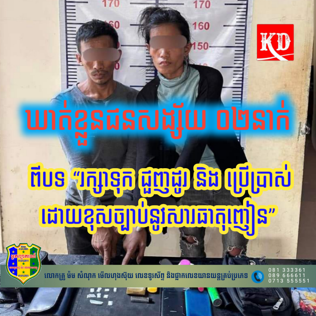 ខេត្តសៀមរាប៖ លោកវរសេនីយ៍ឯក ដា ចំរើន អធិការ នៃអធិការដ្ឋាននគរបាលក្រុងសៀមរាប បានដឹកនាំកម្លាំងផ្នែកប្រឆាំងគ្រឿងញៀន ចុះបង្ក្រាប និងឃាត់ខ្លួនជនសង្ស័យចំនួន ០២នាក់ ពីបទ “រក្សាទុក ជួញដូរ និង ប្រើប្រាស់ដោយខុសច្បាប់នូវសារធាតុញៀន” កាលពីរសៀលថ្ងៃទី ០២ ខែ មិថុនា ឆ្នាំ២០២៣ កន្លងទៅនេះ។