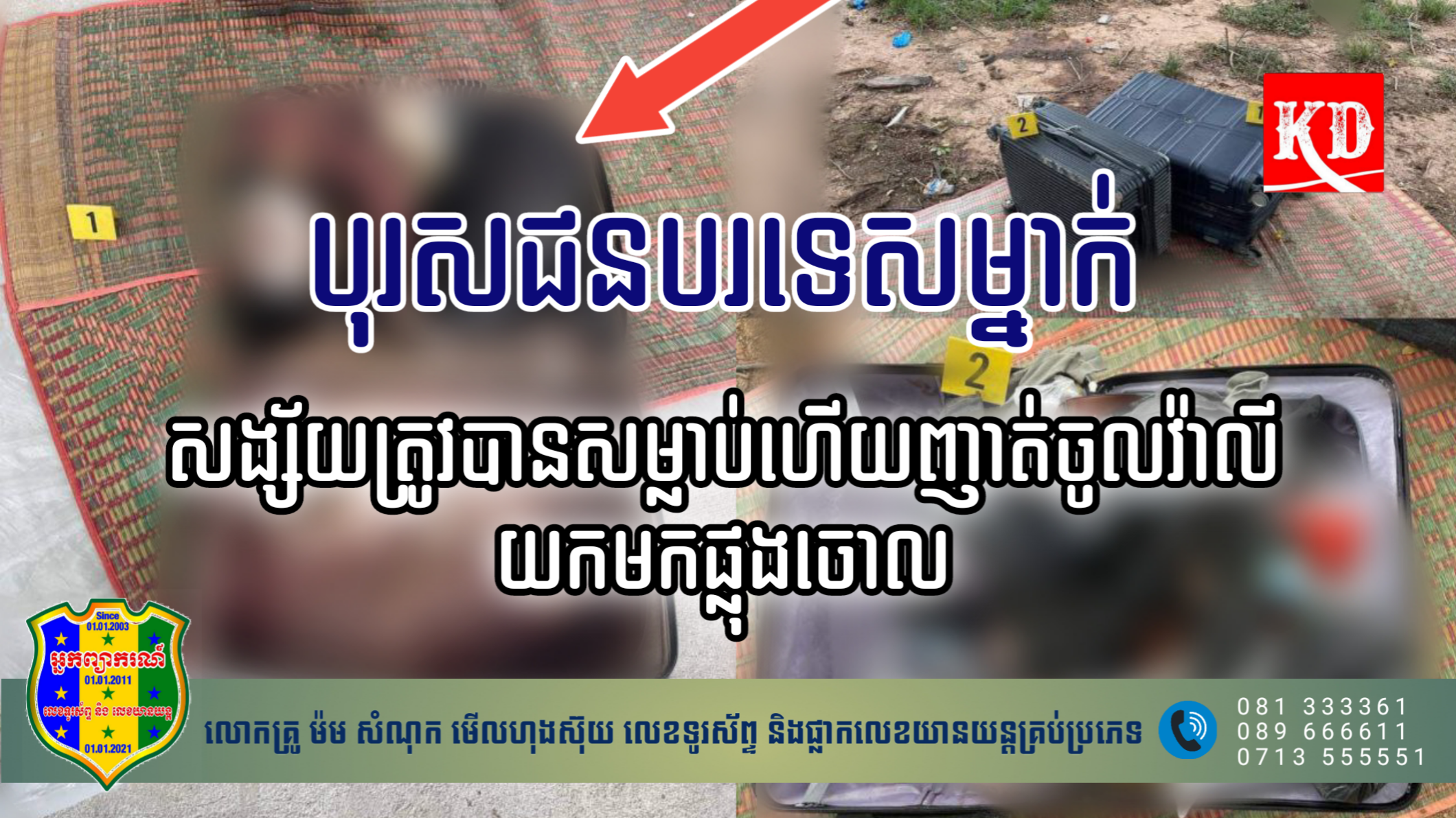 ខេត្តកណ្តាល៖ បុរសជនបរទេសម្នាក់ ត្រូវបានប្រទះឃើញស្លាប់ ដោយសពញាត់ចូលវ៉ាលីផ្លុងចោល កាលពីវេលាម៉ោងប្រហែល ០៩ និង ០០ នាទី ព្រឹកថ្ងៃទី០៣ ខែមិថុនា ឆ្នាំ ២០២៣។