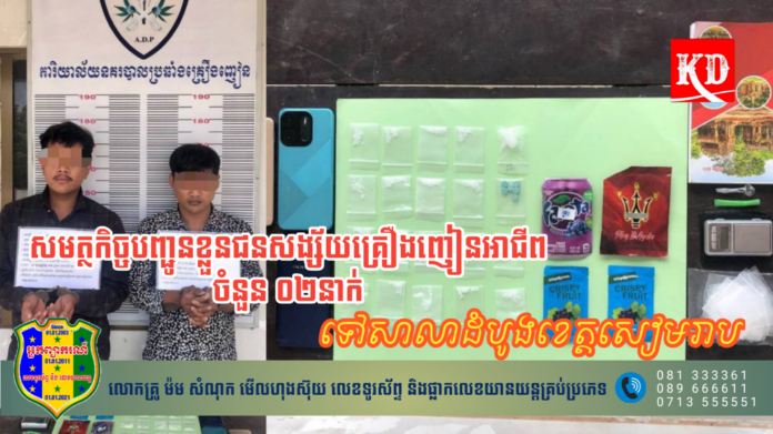 ទី០១ មានឈ្មោះ ប៊ិន សុទី ភេទប្រុស អាយុ ២៦ឆ្នាំ ជនជាតិខ្មែរ គ្មានមុខរបរ មានទីលំនៅ ភូមិប្រឡាយ សង្កាត់សៀមរាប ក្រុងសៀមរាប ខេត្តសៀមរាប មានសារធាតុញៀននៅក្នុងខ្លួន និងទី២ មានឈ្មោះ គា សុវណ្ណរិទ្ធ ភេទប្រុស អាយុ ១៨ឆ្នាំ ជនជាតិខ្មែរ មុខរបរ (គ្មាន) មានទីលំនៅ ភូមិពោធ៍បន្ទាយជ័យ សង្កាត់សៀមរាប ក្រុងសៀមរាប ខេត្តសៀមរាប សមត្ថកិច្ចក៍ពិនិត្យរកឃើញមានសារធាតុ ញៀននៅក្នុងខ្លួនផងដែរ។