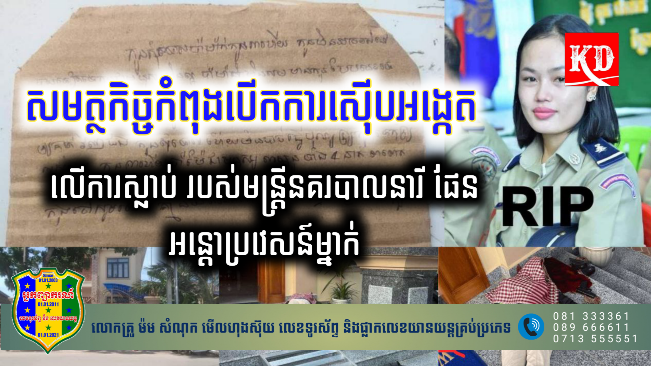 រាជធានីភ្នំពេញ៖ សមត្ថកិច្ចកំពុងបើកការស៊ើបអង្កេត លើករណី មន្រ្តីនគរបាលនារី ផែនអន្តោប្រវេសន៍ម្នាក់ នៅខណ្ឌព្រែកព្នៅ ដែលបានស្លាប់ ដោយប្រើកាំភ្លើងខ្លីបាញ់ ក្នុងស្ថានភាពហាក់បីដូចជាសម្លាប់ខ្លួន នៅចំណុចខាងមុខទ្វារផ្ទះគ្មានលេខមួយកន្លែង ដែលស្ថិតតាមបណ្ដោយផ្លូវបេតុង ភូមិគ្រួស សង្កាត់សំរោង ខណ្ឌព្រែកព្នៅ រាជធានីភ្នំពេញ នៅព្រឹកថ្ងៃទី០៥ ខែមិថុនា ឆ្នាំ២០២៣នេះ។