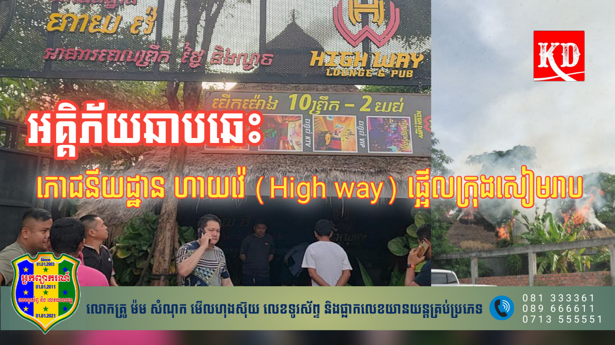 ប្រភពពីសមត្ថកិច្ចបានឱ្យដឹងថា មានករណីអគ្គីភ័យឆាបឆេះ ភោជនីយដ្ឋានHigh way បង្ករឡើងដោយ ឈ្មោះ សូ សំណាង ភេទប្រុស អាយុ ៤៣ឆ្នាំ រស់នៅភូមិសាលាកន្សែង សង្កាត់ស្វាយដង្គំ ក្រុងសៀមរាប ខេត្តសៀមរាប។