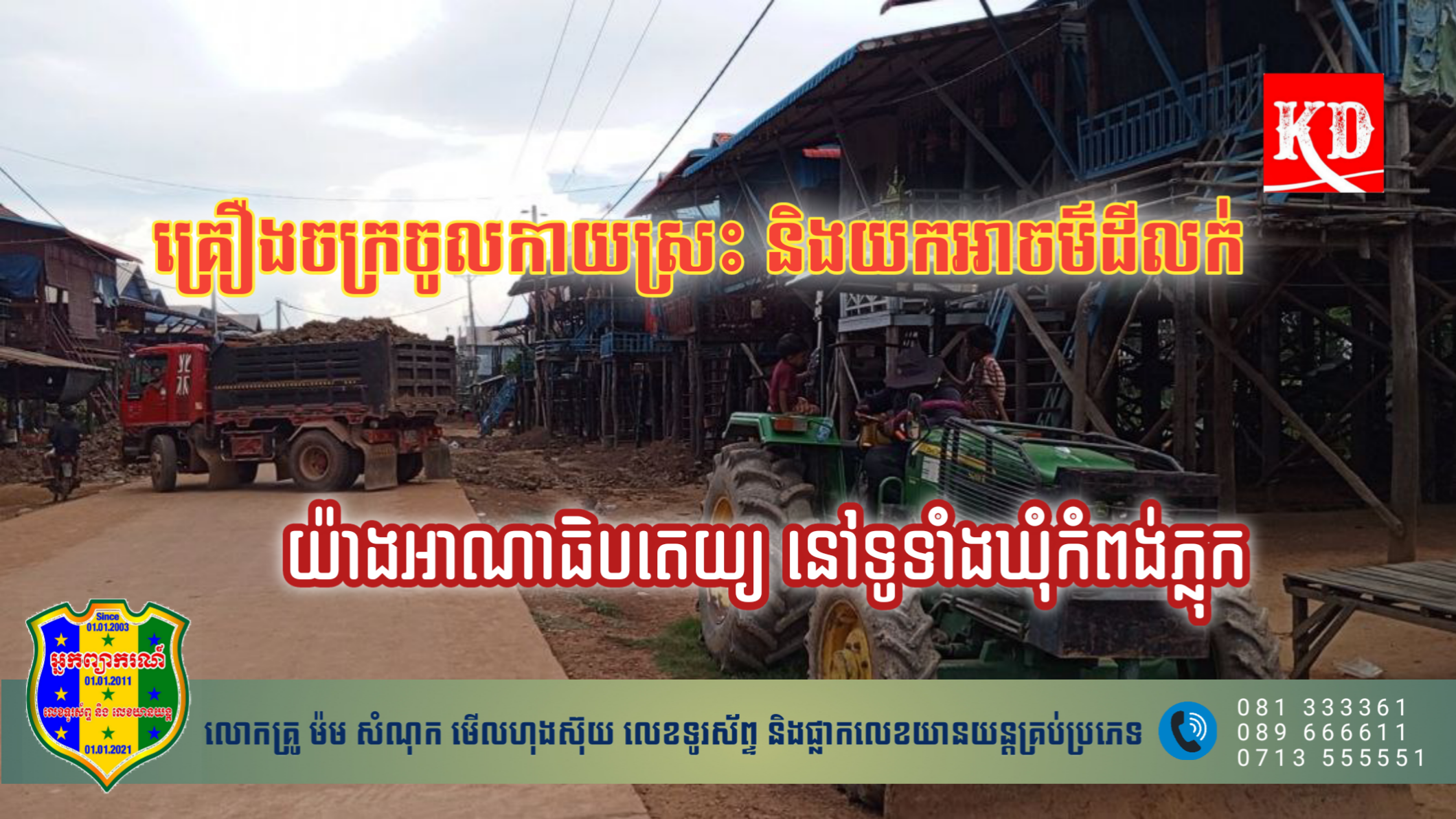 ប្រជាពលរដ្ឋបន្តថា ក្រុមគ្រឿងចក្រទាំងនោះសង្ស័យថាគ្មានច្បាប់អនុញ្ញាតិ ត្រឹមត្រូវនោះទេ ដោយការដឹកទៀតសោត គឺប្រើប្រាស់ផ្លូវបេតុងថ្មី ដែលហាក់មានសភាពមិនរឹងមាំ ព្រោះកាលពីរដូវវស្សាកន្លងទៅទឹកលិច។ កំណាត់ផ្លូវនេះកន្លងមកមិនត្រូវបានអនុញ្ញាតិឱ្យរថយន្ដធន់ធំ និងធ្ងន់បើកបរលើនោះទេ។