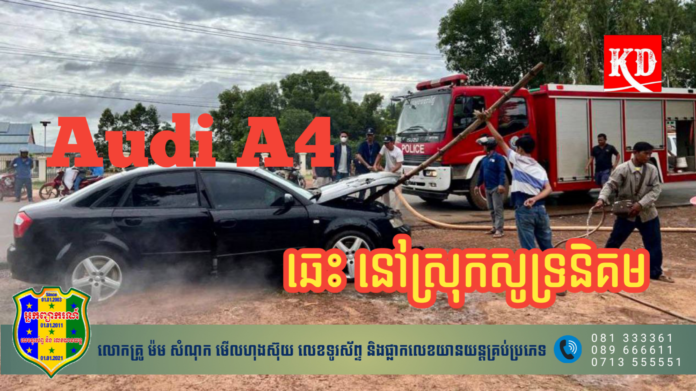 ខេត្តសៀមរាប៖ មានករណីអគិ្គភ័យឆាបឆេះរថយន្តម៉ាក Audi A4 ស៊េរីឆ្នាំ២០០៣ ពណ៌ខ្មៅ ពាក់ផ្លាកលេខ ភ្នំពេញ 2W-6283 នៅលើផ្លូវជាតិលេខ៦ ត្រង់ចំណុចខាងមុខភោជនីយដ្ឋានរតនៈចិន្តា ស្ថិតនៅភូមិគោករលួស ឃុំដំដែក ស្រុកសូទ្រនិគម ខេត្តសៀមរាប នៅវេលាម៉ោង 09 និង 30នាទីថ្ងៃទី03 ខែកក្កដា ឆ្នាំ2023។