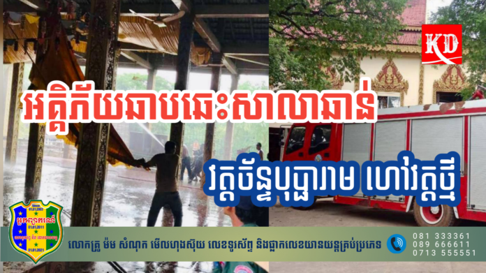 ខេត្តសៀមរាប៖ ករណីអគ្គិភ័យមួយកើតឡើងបណ្តាលឲ្យឆេះសាលាឆាន់នៅវត្តច័ន្ទបុប្ផារាម(ហៅវត្តថ្មី) ដែលស្ថិតក្នុងភូមិភ្នៀត ឃុំជីក្រែង ស្រុកជីក្រែង ខេត្តសៀមរាប កាលពីវេលាម៉ោង១៤ និង៣០នាទីថ្ងៃទី០៦ ខែកក្កដា ឆ្នាំ២០២៣កន្លងទៅនេះ។