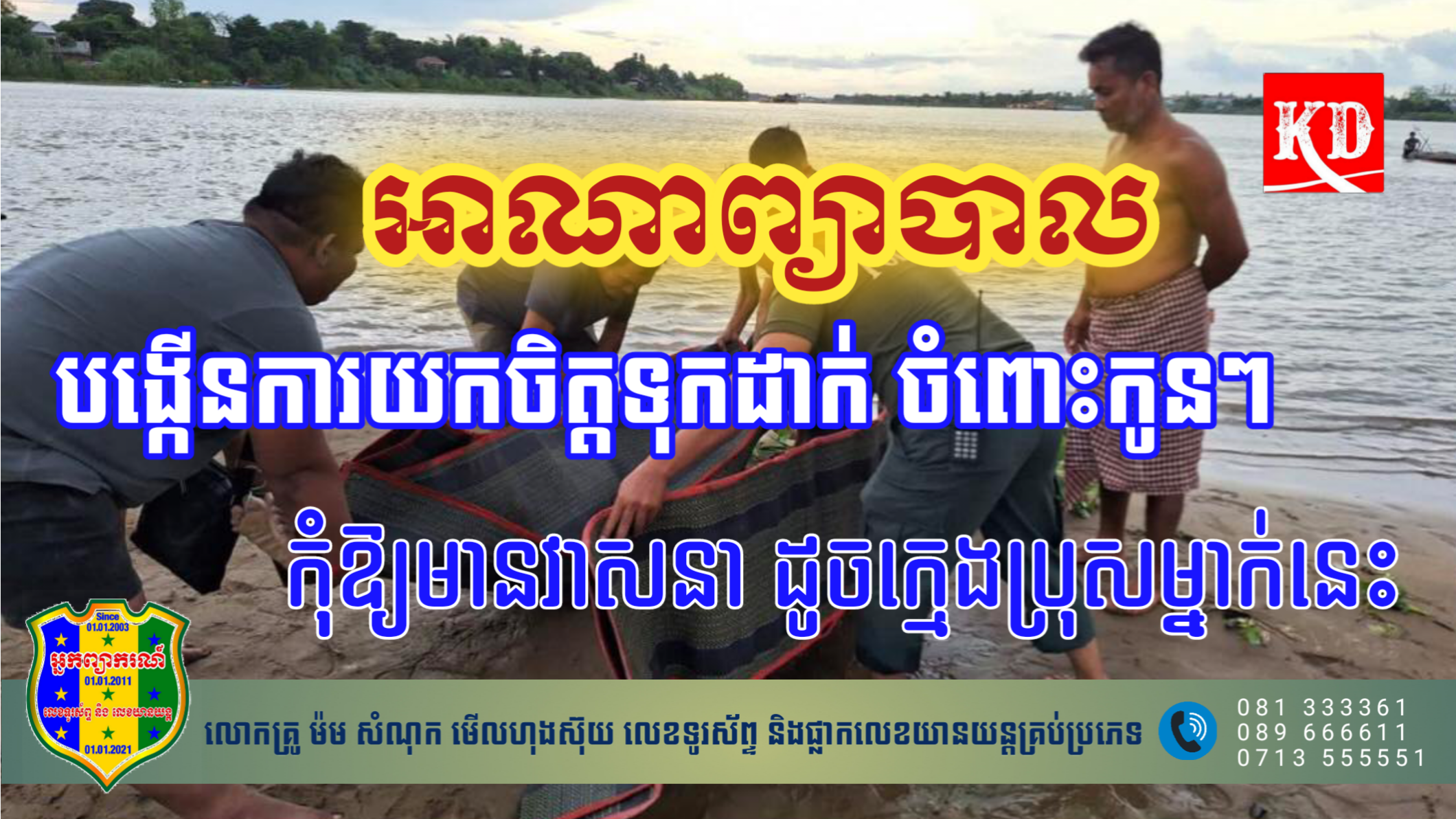 ខេត្តកណ្តាល៖ ក្មេងប្រុសម្នាក់ក្នុងចំណោមក្មេងប្រុសៗ ដែលជាសិស្សសាលាជាច្រើននាក់ ប្រាប់ឪពុកម្តាយថា មករៀន តែបែរជាគេចមកលេងទឹក បណ្ដាលឱ្យស្លាប់ នៅចំណុចកន្លែងកំសាន្ត ក្បាលកោះខ្សាច់ទន្លា ស្ថិតក្នុងភូមិក្បាលកោះកើត ឃុំកោះខ្សាច់ទន្លា ស្រុកស្អាង ខេត្តកណ្ដាល កាលពីរសៀលនៅថ្ងៃទី១៤ ខែកក្កដា ឆ្នាំ២០២៣កន្លងទៅ។