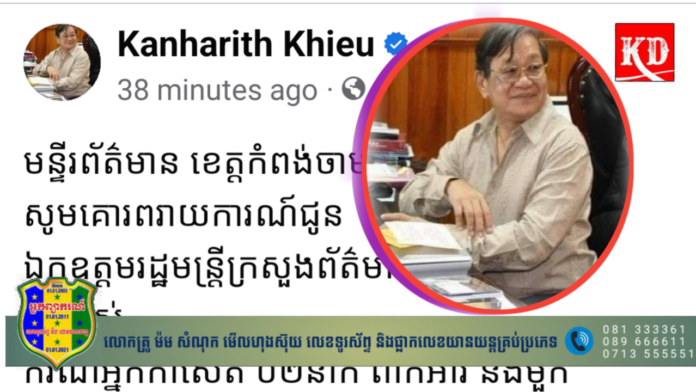 រាជធានីភ្នំពេញ៖ មន្ទីរព័ត៌មានខេត្តកំពង់ចាម រាយការណ៍ជូន ឯកឧត្តមរដ្ឋមន្ត្រីក្រសួងព័ត៌មាន ពីករណីអ្នកកាសែត ចំនួន ០២នាក់ ពាក់អាវ និងមួកគណបក្សប្រជាជនកម្ពុជា ចូលថតក្នុងផ្ទះទីតាំងឆ្នោតឡូតូ ១កន្លែង ស្ថិតនៅក្នុងភូមិ៣ សង្កាត់វាលវង់ ក្រុងខេត្តកំពង់ចាម ខេត្តកំពង់ចាម កាលពីថ្ងៃទី១៧ ខែកក្កដា ឆ្នាំ២០២៣កន្លងទៅ។ នេះបើយោងតាមការបង្ហោះឱ្យដឹងនៅលើ ហ្វេសប៊ុក ផ្លូវការណ៍របស់ ឯកឧត្តម ខៀវ កញ្ញារិទ្ធិ រដ្ឋមន្ត្រីក្រសួងព័ត៌មានកម្ពុជា ដែលមានឈ្មោះថា kanharit khieu នៅរសៀលថ្ងៃទី១៨ ខែកក្កដា ឆ្នាំ២០២៣នេះ។