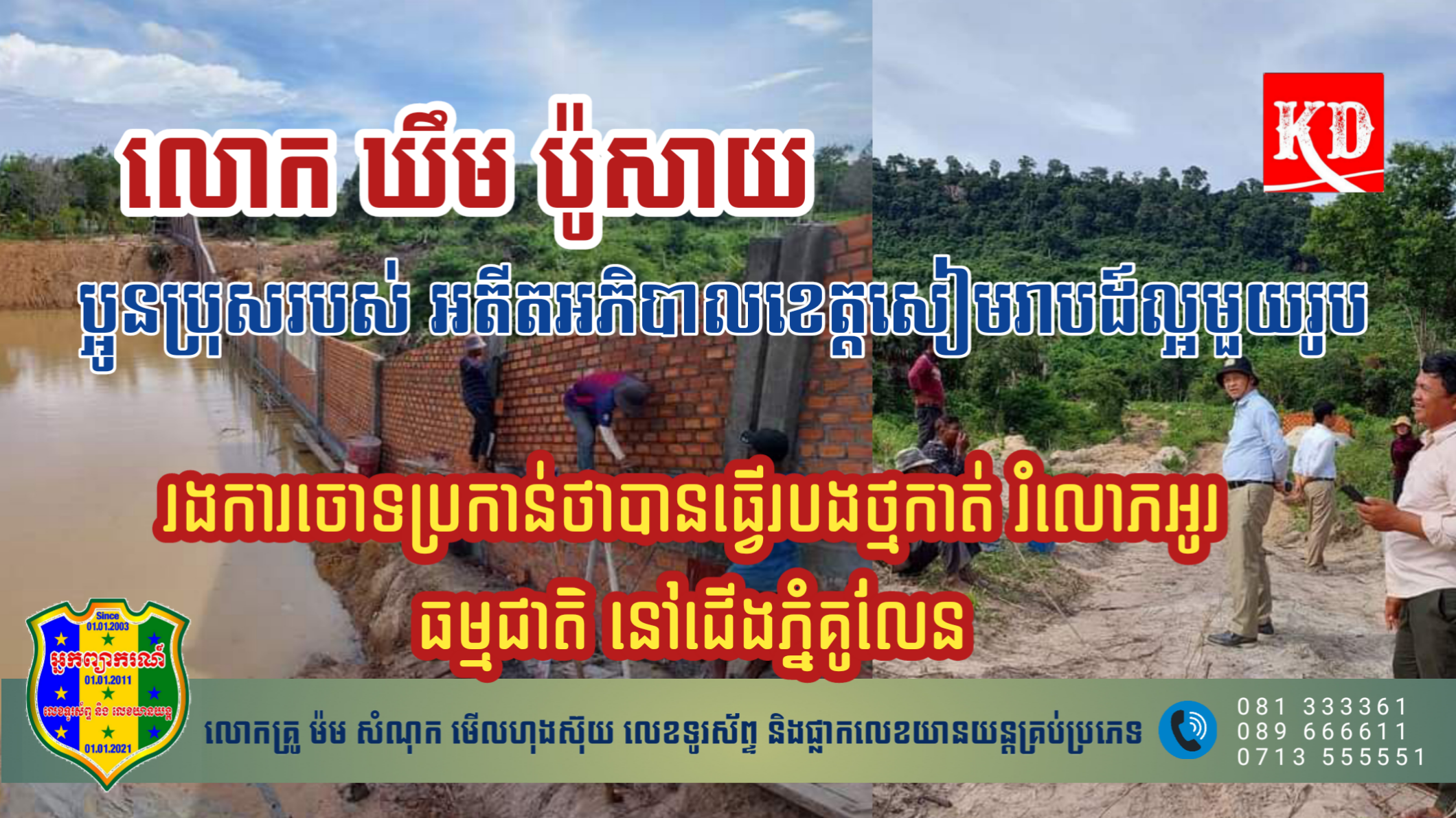 ខេត្តសៀមរាប៖ លោក ឃឹម ប៉ូសាយ ប្អូនប្រុសរបស់ អតីតអភិបាលខេត្តសៀមរាបដ៍ល្អមួយរូប រងការចោទប្រកាន់ថាបានធ្វើរបងថ្មកាត់ រំលោភអូរធម្មជាតិ នៅជើងភ្នំគូលែន។ នេះបើយោងតាមប្រភពព័ត៌មានពីមន្ត្រីមូលដ្ឋានដែលសុំមិនបញ្ចេញឈ្មោះ នៅរសៀលថ្ងៃទី១៨ ខែកក្កដា ឆ្នាំ២០២៣នេះ។