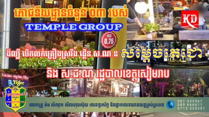 ខេត្តសៀមរាប៖ នៅយប់ថ្ងៃទី២២ និងឈានចូលថ្ងៃទី២៣ ខែកក្កដា ឆ្នាំ២០២៣ គេសង្កេតឃើញថា មានភោជនីយដ្ឋានចំនួន ០៣ របស់ Temple Group ដ៍ល្បី មាន Temple Food n Beverage, Temple Design និង Temple Sky Bar បានបើកលក់គ្រឿងស្រវឹង ផ្គើនទៅនឹង សេចក្ដីណែនាំ របស់រាជរដ្ឋាភិបាល លេខ ០២ សណន ដែលចុះហត្ថលេខា ដោយ សម្ដេចអគ្គមហាសេនាបតីតេជោ ហ៊ុន សែន នាយករដ្ឋមន្ត្រី នៃព្រះរាជាណាចក្រកម្ពុជា កាលពីថ្ងៃទី០២ ខែឧសភា ឆ្នាំ២០២៣ កន្លងទៅ ស្ដីពីការផ្អាកការលក់ដូរ និងពិសាគ្រឿងស្រវឹងមួយថ្ងៃមុនថ្ងៃបោះឆ្នោត និងថ្ងៃបោះឆ្នោតជ្រើសតាំងតំណាងរាស្ត្រ នីតិកាលទី៧ ឆ្នាំ២០២៣ គឺថ្ងៃទី២២ និងថ្ងៃទី២៣ ខែកក្កដា ឆ្នាំ២០២៣ និង សេចក្ដីជូនដំណឹង (ស.ជ.ណ ) លេខ ៦២៨/២៣ សជណ របស់រដ្ឋបាលខេត្តសៀមរាប ស្ដីពី ការផ្អាកការលក់ដូរនិងពិសាគ្រឿងស្រវឹង មួយថ្ងៃមុនថ្ងៃបោះឆ្នោត និងថ្ងៃបោះឆ្នោត ជ្រើសតាំងតំណាងរាស្ត្រនីតិកាលទី ៧ ឆ្នាំ ២០២៣ គឺថ្ងៃទី ២២ និងថ្ងៃទី ២៣ ខែកក្កដាឆ្នាំ ២០២៣ដែលបានចុះហត្ថលេខាដោយ ឯកឧត្តម ប្រាក់ សោភ័ណ អភិបាលរងខេត្តសៀមរាប កាលពីថ្ងៃទី១៤ ខែមិថុនា ឆ្នាំ២០២៣ កន្លងទៅ។