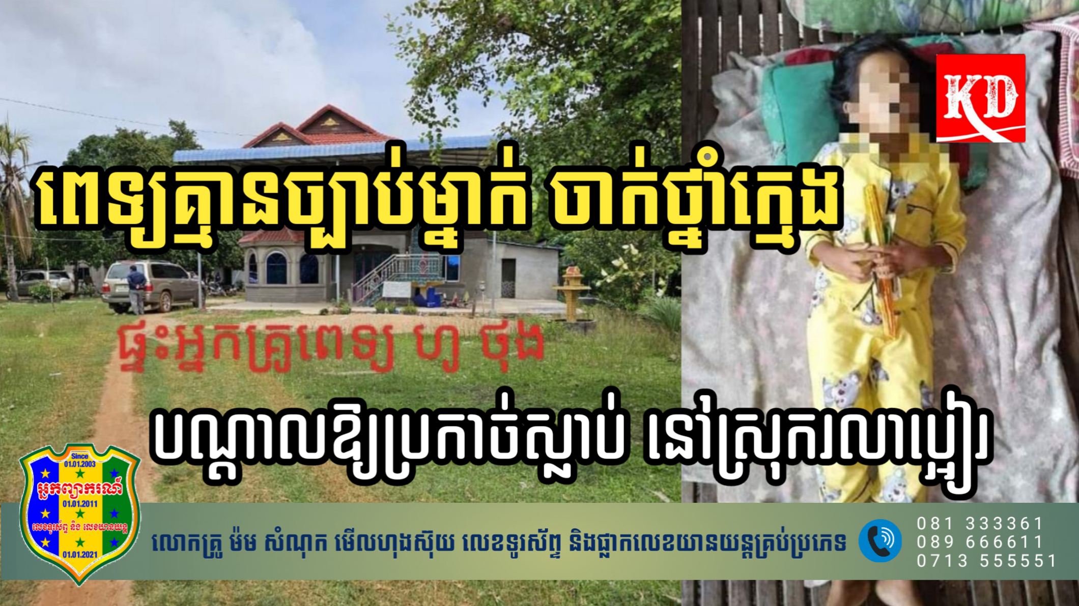 ខេត្តកំពង់ឆ្នាំង៖ អ្នកគ្រូពេទ្យម្នាក់មានឈ្មោះ ហូ ថុង រស់នៅភូមិផ្លូវគោ ឃុំបន្ទាយព្រាល ស្រុករលាប្អៀរ ខេត្តកំពង់ឆ្នាំង បើកព្យាបាលជំងឺ ដោយគ្មានច្បាប់អនុញ្ញាតត្រឹមត្រូវ បានចាក់ថ្នាំក្មេងស្រីម្នាក់បណ្ដាលឱ្យប្រកាច់ និង ស្លាប់ បន្ទាប់អាណាព្យាបាលព្យាយាមបញ្ជួន ទៅព្យាបាលបន្ត នៅមន្ទីរពេទ្យបង្អែកខេត្តកំពង់ឆ្នាំង កាលពីរសៀលថ្ងៃទី ២២ ខែកក្កដា ឆ្នាំ២០២៣ កន្លងទៅ។