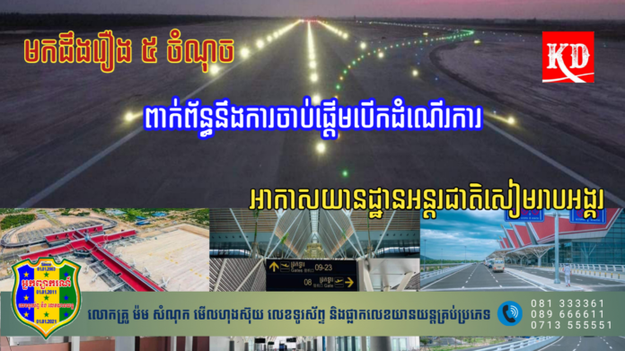 រាជធានីភ្នំពេញ៖ រដ្ឋលេខាធិការដ្ឋានអាកាសចរណ៍ស៊ីវិល បានចេញសេចក្ដីជូនដំណឹងលេខ ១៤៤៣ រ.ល.អ.ស ចុះថ្ងៃទី ២៦ ខែកក្កដា ឆ្នាំ២០២៣ ស្ដីពីការចាប់ផ្ដើមបើកដំណើរការអាកាសយានដ្ឋានអន្តរជាតិសៀមរាបអង្គរ SiemReap Angkor International Airport ផ្ដល់ជួនរឿង ៥ ចំណុច ដល់សាធារណៈជន ប្រតិបត្តិករប្រកបអាជីវកម្មដឹកជញ្ជូនតាមផ្លូវអាកាសជាតិ និង អន្តរជាតិ ជ្រាបជាព័ត៌មាន។