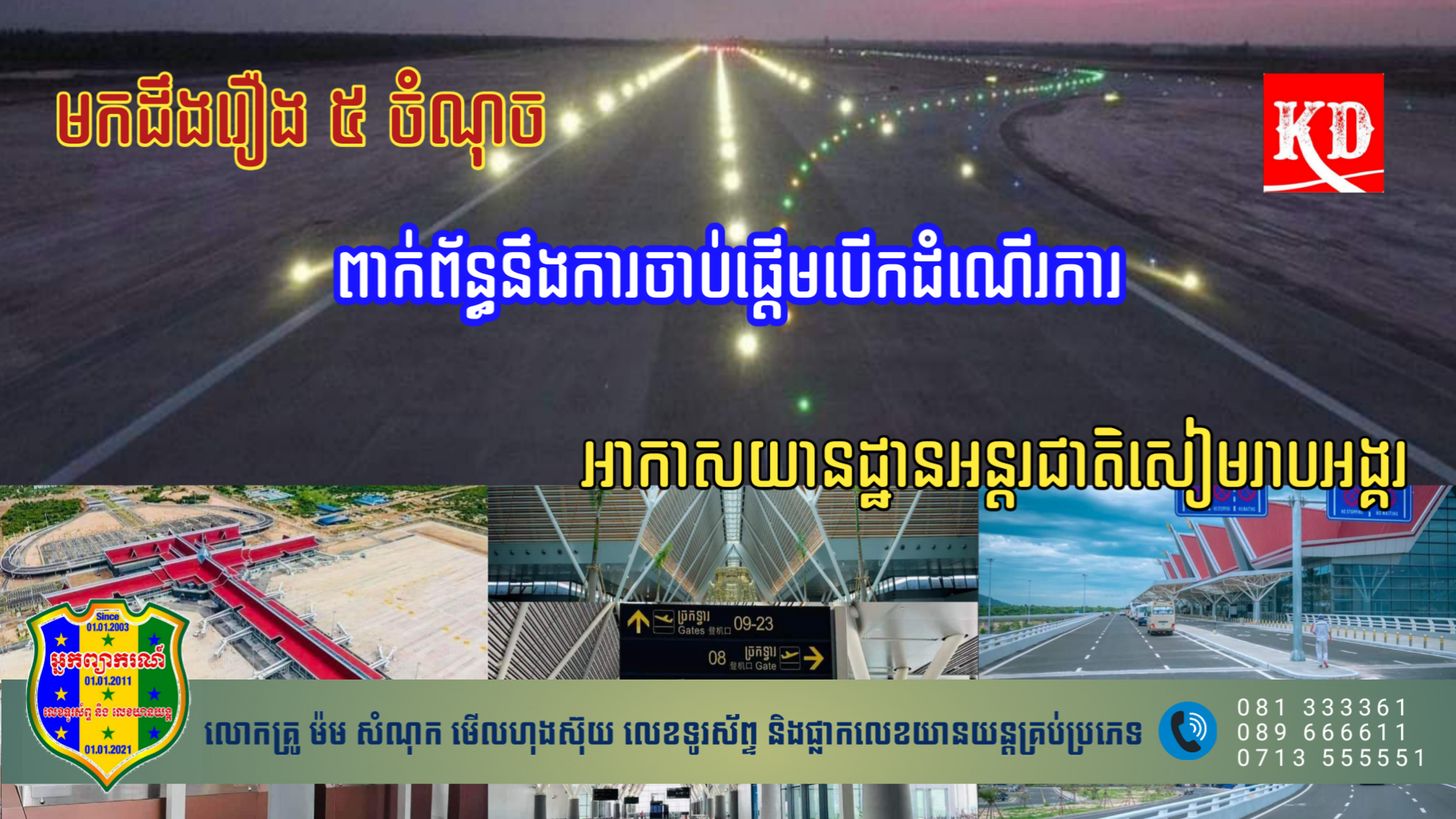 ៥).ដើម្បីចូលរួមរៀបចំផែនការ នៃការផ្ទេរជើងហោះហើរអាជីវកម្មដឹកជញ្ជូនអ្នកដំណើរ និងទំនិញតាមផ្លូវអាកាស និងការបើកដំណើរការ អាកាសយានដ្ឋានអន្តរជាតិសៀមរាបអង្គរ (SiemReap Angkor International Airport) រដ្ឋលេខាធិការរដ្ឋានអាកាសចរណ៍ស៊ីវិល ស្នើសុំប្រតិបត្តិករប្រកបអាជីវកម្មដឹកជញ្ជូនតាមផ្លូវអាកាសជាតិ អន្តរជាតិ និងគ្រប់ភាគីពាក់ព័ន្ធទាំងអស់ អាចចាប់ផ្ដើមទំនាក់ទំនង ចាប់ពីពេលនេះតទៅ៕នាគស
