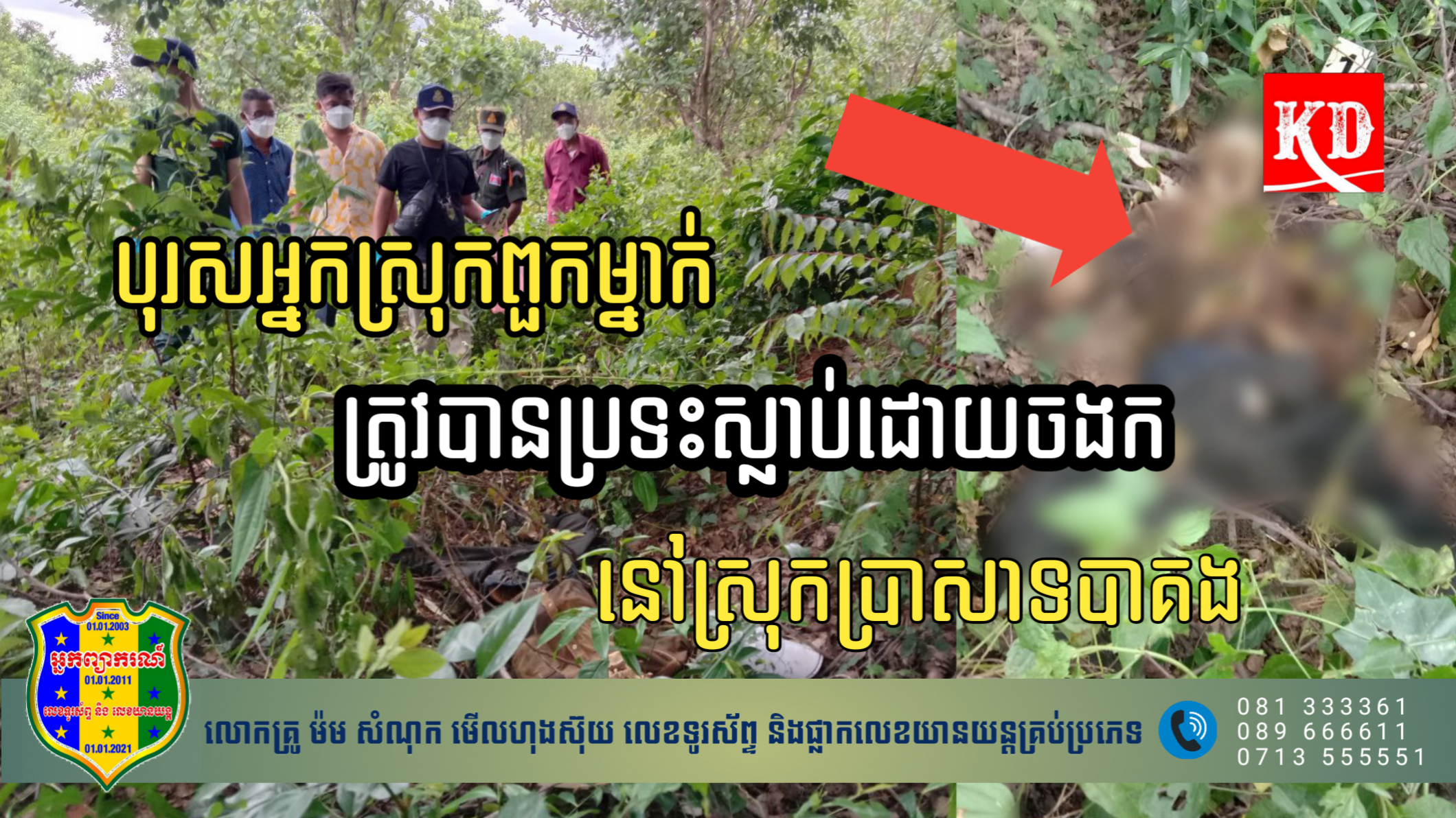 ខេត្តសៀមរាប៖ បុរសអ្នកស្រុកពួកម្នាក់ មានឈ្មោះ អ៊ាន សីហា ភេទប្រុសអាយុ ៣៧ឆ្នាំ ទីលំនៅបច្ចុប្បន្ន រស់នៅ ភូមិដូនកែវ ឃុំដូនកែ វស្រុកពួក ខេត្តសៀមរាប ត្រូវបានប្រទះឃើញស្លាប់ ដោយចងក នៅត្រង់ចំណុច ដើមក្រឡាញ់ក្នុងបរិវេណដីរបស់ឈ្មោះស៊ាន រី ភេទស្រី ស្ថិតនៅភូមិស្នាសង្គ្រាម ឃុំបល្ល័ង្កស្រុក ប្រាសាទបាគង ខេត្តសៀមរាប កាលពីវេលាម៉ោង ១១ និង ៣០ នាទីថ្ងៃទី២៩ ខែកក្កដា ឆ្នាំ ២០២៣ កន្លងទៅនេះ។