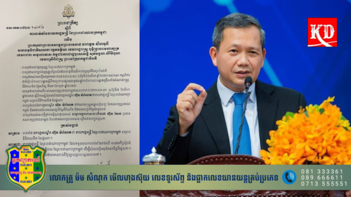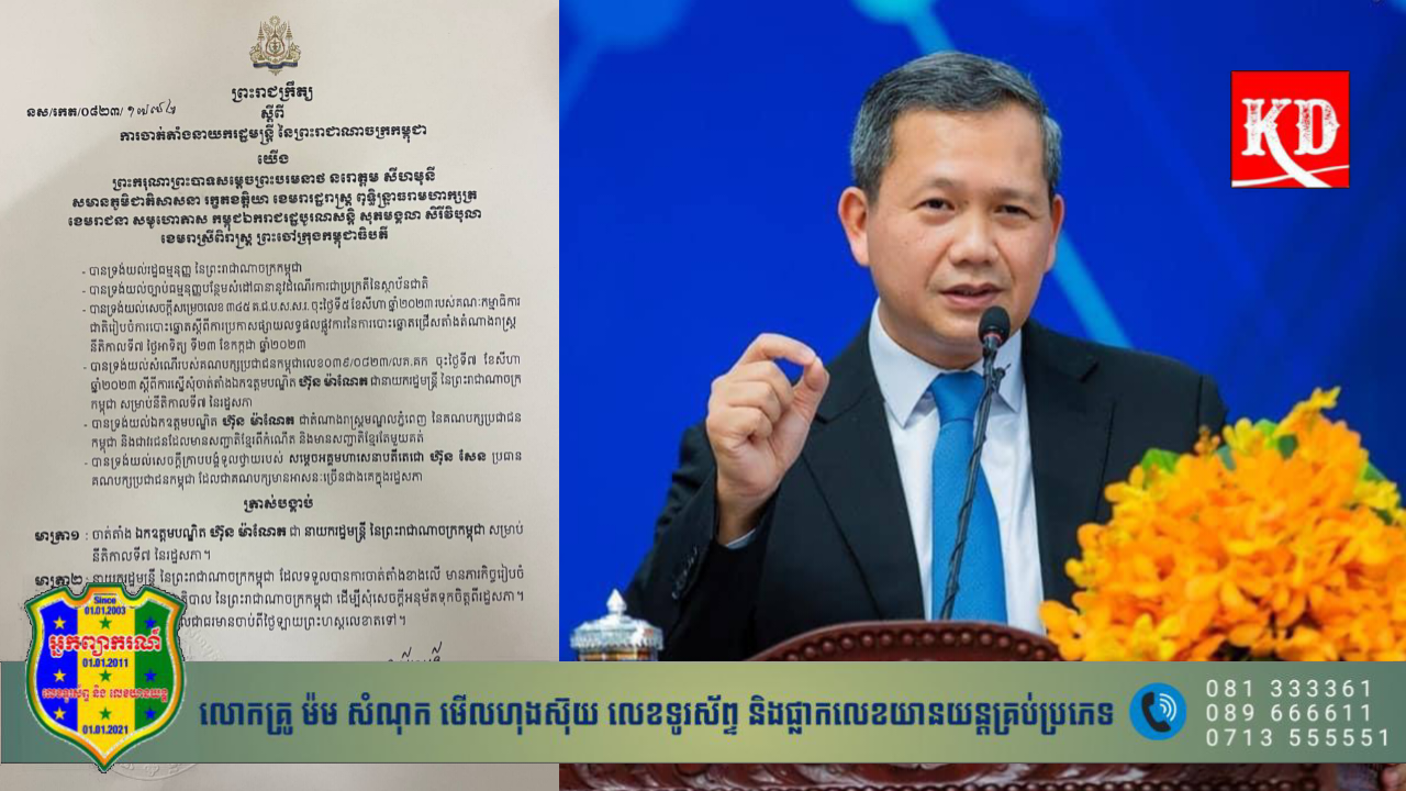 រាជធានីភ្នំពេញ៖ នៅថ្ងៃទី៧ ខែសីហា ឆ្នាំ២០២៣ នេះ ព្រះករុណាព្រះបាទសម្ដេចព្រះបរមនាថ នរោត្តម សីហមុនី ព្រះមហាក្សត្រ នៃព្រះរាជាណាចក្រកម្ពុជា បានចេញព្រះរាជក្រឹត្យ ត្រាស់បង្គាប់តែងតាំង លោកបណ្ឌិត ហ៊ុន ម៉ាណែត ជានាយករដ្ឋមន្ត្រីថ្មីរបស់កម្ពុជា នៅក្នុងនីតិកាលទី៧ ចាប់ពីថ្ងៃទី២២ ខែសីហា ឆ្នាំ២០២៣ ដល់ឆ្នាំ២០២៨។
