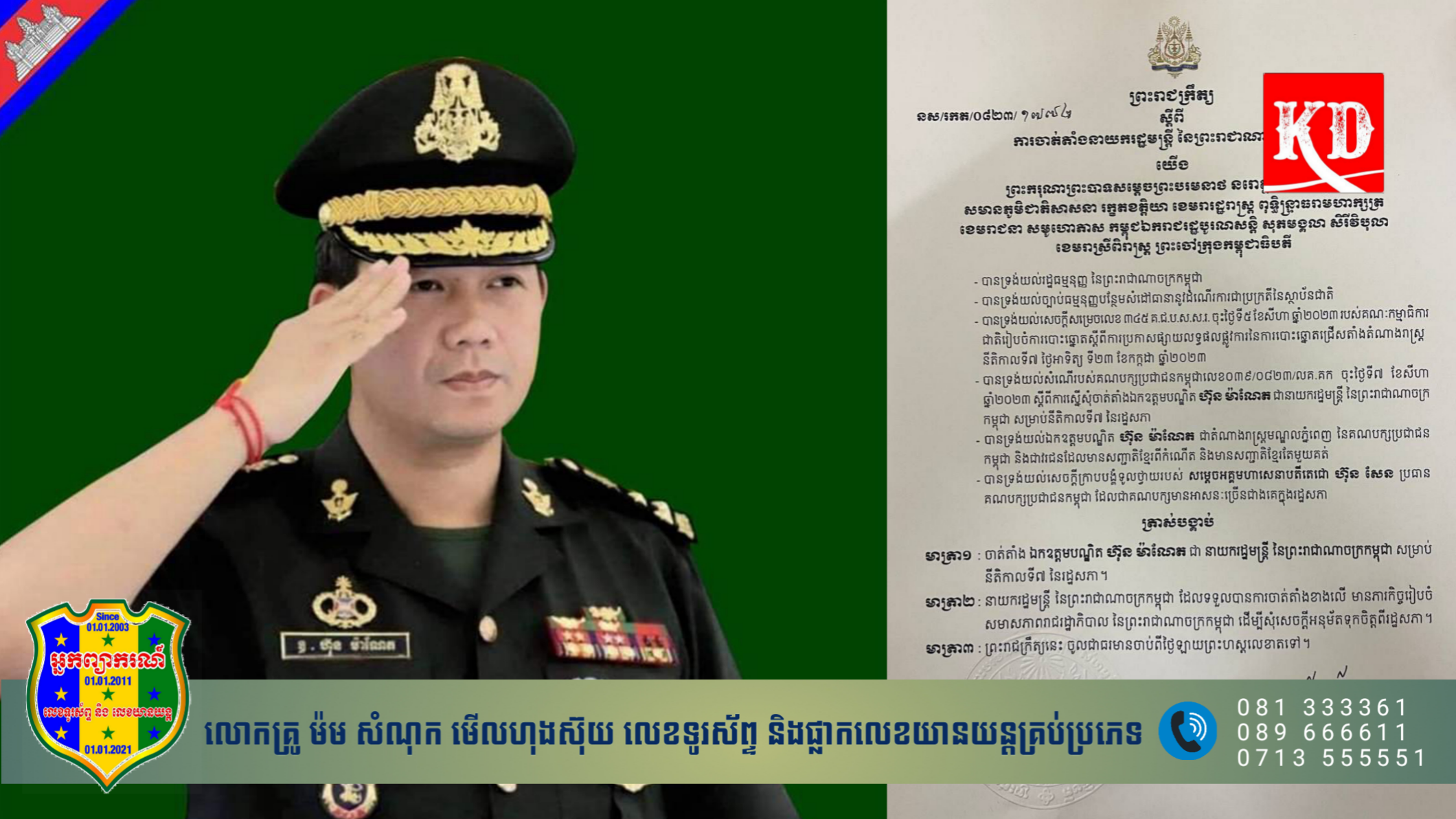 រាជធានីភ្នំពេញ៖ លោកនាយករដ្ឋមន្ត្រីថ្មី ប្តេជ្ញាចិត្តខិតខំអោយអស់ពីសមត្ថភាព ដើម្បីបំពេញបេសកកម្មដ៏ឧត្តុង្គឧត្តមថ្លៃថ្លា ក្នុងការបម្រើជាតិ ជួនប្រជាជនកម្ពុជា។ នេះបើយោងតាម facebook ផ្លូវការ របស់លោក ដែលមានឈ្មោះថា “Hun Manet” នៅព្រឹកថ្ងៃទី ៩ ខែសីហាឆ្នាំ ២០២៣។
