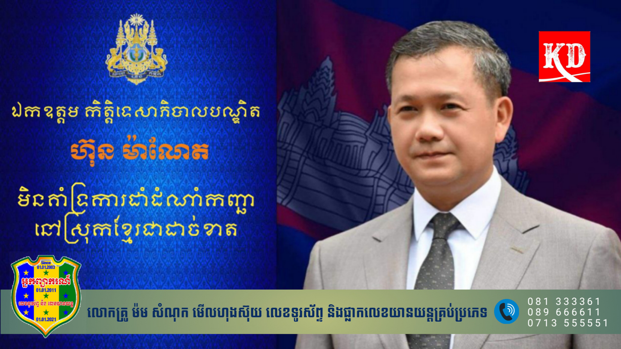 រាជធានីភ្នំពេញ៖ ឯកឧត្តម កិត្តិទេសាភិបាលបណ្ឌិត ហ៊ុន ម៉ាណែត នាយករដ្ឋមន្ដ្រីនៃព្រះរាជាណាចក្រកម្ពុជា នាពេលដ៍ខ្លីខាងមុខ បានប្រកាសជំហរដោយប្រឆាំងដាច់ខាត ចំពោះការដាំដំណាំកញ្ឆា នៅក្នុងប្រទេសកម្ពុជា។ ថ្លែងបែបនេះតាមរយៈសម្រង់សម្ដី ដែលបានបង្ហោះនៅលើទំព័រ Facebook ផ្លូវការរបស់ឯកឧត្ដម នៅថ្ងៃទី១៦ ខែសីហា ឆ្នាំ២០២៣នេះ។