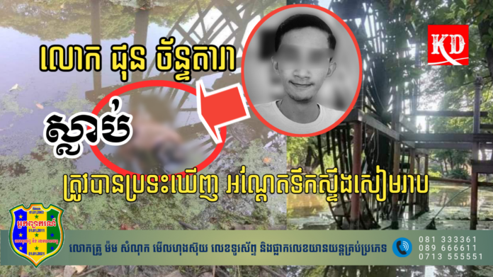 សមត្ថកិច្ចថា សពជនរងគ្រោះត្រូវបានប្រទះឃើញ ទើរក្បែរច្រាំងនៃស្ទឹងសៀមរាប ក្រោមរហាត់ទឹក របស់ផ្សារ”ឃីងស៍រូដអង្គរ” (King’s Road Angkor) ស្ថិតក្នុងភូមិវត្តបូព៌ សង្កាត់សាលាកំរើក ក្រុងសៀមរាប ខេត្តសៀមរាប នៅវេលាម៉ោង ៨ និង ០០នាទីថ្ងៃទី១៩ ខែសីហា ឆ្នាំ២០២៣នេះ។
