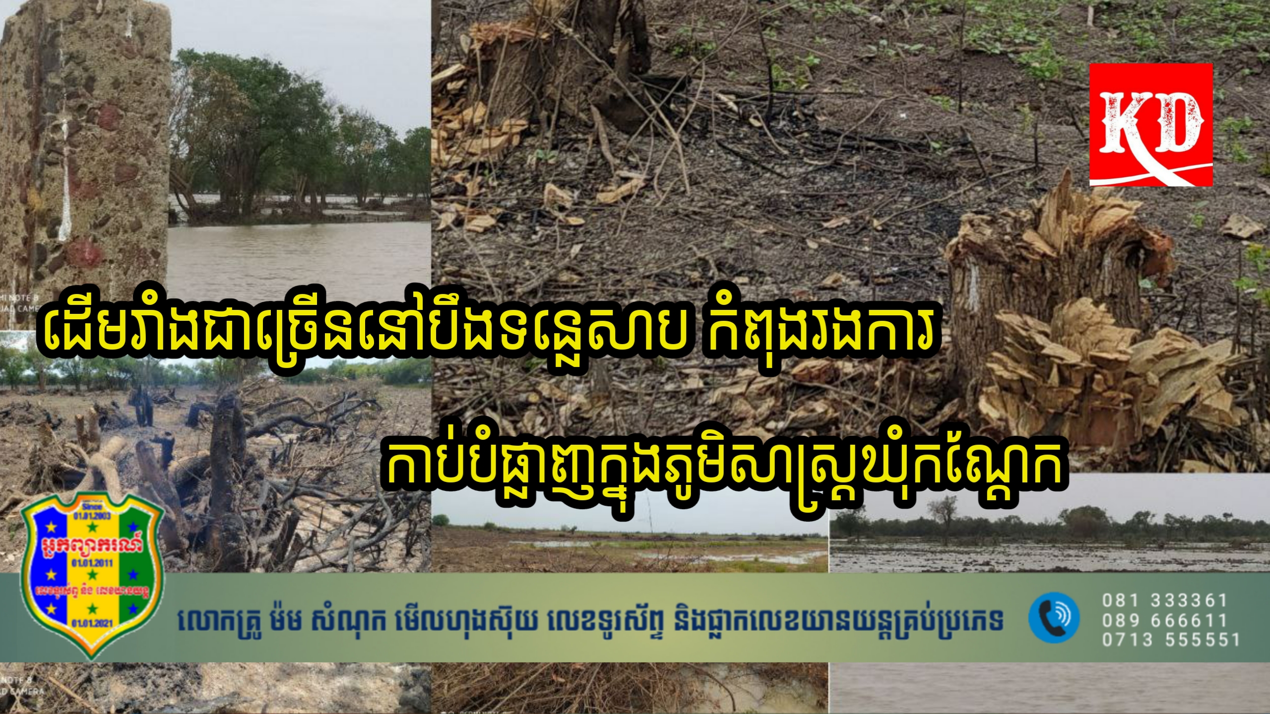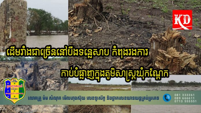 ខេត្តសៀមរាប៖ ដើមរាំងជាច្រើន ដែលជាជំរកត្រីពងកូន ជុំវិញបឹងទន្លេសាប បាននឹងកំពុងរងការកាប់បំផ្លាញក្នុងភូមិសាស្ត្រឃុំកណ្តែក ស្រុកប្រាសាទបាគង ខេត្តសៀមរាប។ នេះបើយោងតាម សេចក្ដីរាយការណ៍ ដែលភ្នាក់ងារ អង្គភាពបណ្ដាញសារព័ត៌មាន គេហទំព័រ គូលែដេលី ទើបនឹងទទួលបាននៅរសៀលថ្ងៃទី ២២ ខែសីហា ឆ្នាំ២០២៣នេះ។