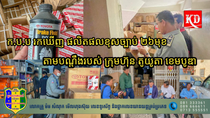 រាជធានីភ្នំពេញ៖ អគ្គនាយកដ្ឋានការពារអ្នកប្រើប្រាស់ កិច្ចការប្រកួតប្រជែង និងបង្រ្កាបការក្លែងបន្លំ ហៅកាត់ថា “ក.ប.ប” បានចាត់វិធានការត្រួតពិនិត្យ និងបង្រ្កាបទៅលើផលិតផលក្លែងបន្លំ ក្លែងក្លាយ បំពានសិទ្ធិផ្តាច់មុខ និងខុសច្បាប់ ទៅតាមបណ្តឹងរបស់ក្រុមហ៊ុន តូយូតា ខេមបូឌា ដោយប្រើរយៈពេល ០៥ថ្ងៃ គិតចាប់ពីថ្ងៃទី១៥ ដល់ថ្ងៃទី១៩ ខែសីហា ឆ្នាំ២០២៣។
