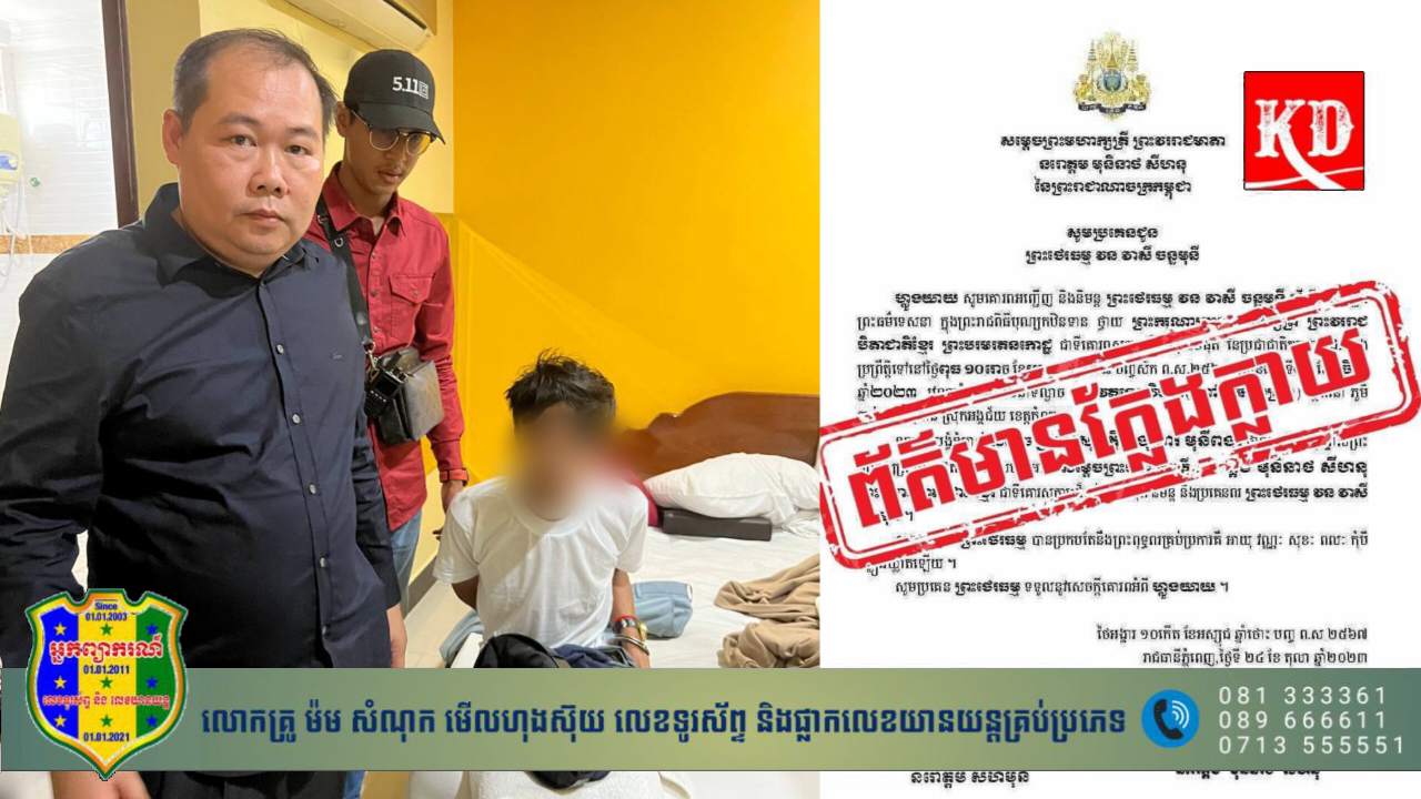 រាជធានីភ្នំពេញ៖ សមត្ថកិច្ចរកឃើញ និងឃាត់ខ្លួនយុវជនម្នាក់ដែលសង្ស័យថា ពាក់ព័ន្ធការក្លែងព្រះរាជសារព្រះករុណាព្រះបាទសម្ដេចព្រះបរមនាថ នរោត្ដមសីហមុនី ព្រះមហាក្សត្រ នៃ ព្រះរាជាណាចក្រកម្ពុជា និង ព្រះមហាក្សត្រី នរោត្ដម មុនីនាថ សីហនុ ព្រះវររាជមាតាជាតិខ្មែរ ក្នុងសេរីភាព សេចក្តីថ្លៃថ្នូរ និងសុភមង្គល ហើយកាលពីថ្ងៃទី២៩ ខែតុលា ឆ្នាំ២០២៣កន្លងទៅ។
