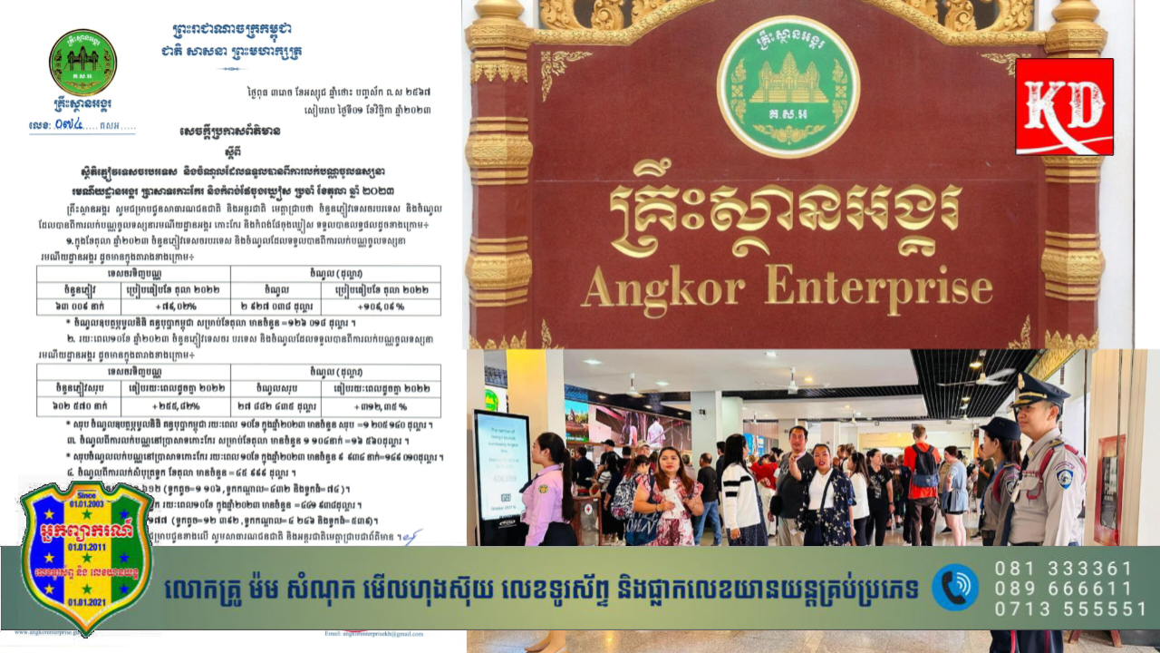 ខេត្តសៀមរាប៖ គ្រឹះស្ថានអង្គរ កាលពីថ្ងៃទី ១ ខែវិច្ឆិកា ឆ្នាំ២០២៣កន្លងទៅ បានចេញសេចក្ដីប្រកាសព័ត៌មាន ជម្រាបជូនសាធារណជនជាតិ និងអន្តរជាតិ មេត្តាជ្រាប អំពីចំនួនភ្ញៀវទេសចរបរទេស និងចំណូល ដែលបានពីការលក់បណ្ណចូលទស្សនារមណីយដ្ឋានអង្គរ កោះកេរ និងកំពង់ផែចុងឃ្លៀស ប្រចាំ ខែតុលា ឆ្នាំ ២០២៣។