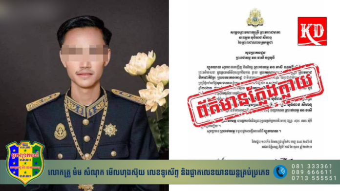 សូមជម្រាបជួនថា ជនសង្ស័យដែលមានឈ្មោះ ហាក់ ឧត្តម ភេទ ប្រុស ត្រូវបានសមត្ថកិច្ចឃាត់ខ្លួន ពាក់ព័ន្ធក្លែង ព្រះរាជសារព្រះករុណាព្រះបាទសម្ដេចព្រះបរមនាថ នរោត្ដមសីហមុនី ព្រះមហាក្សត្រ នៃ ព្រះរាជាណាចក្រកម្ពុជា និង ព្រះមហាក្សត្រី នរោត្ដម មុនីនាថ សីហនុ ព្រះវររាជមាតាជាតិខ្មែរ ក្នុងសេរីភាព សេចក្តីថ្លៃថ្នូរ និងសុភមង្គល កាលពីថ្ងៃទី២៩ ខែតុលា ឆ្នាំ២០២៣កន្លងទៅ។