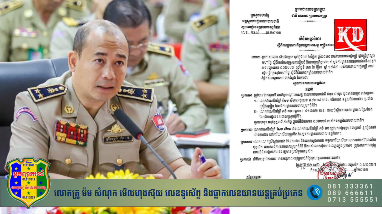 ខេត្តកំពត៖ ស្នងការ នៃស្នងការដ្ឋាននគរបាលខេត្តកំពត បានចេញនៅលិខិតបង្កប់ការ លេខ១៨ ល.ក/០២៣ ដែលចុះហត្ថលេខាដោយ លោកឧត្តមសេនីយ៍ទោ ម៉ៅ ច័ន្ទមធុរិទ្ធ ដោយបង្គាប់ឱ្យផ្អាកតួនាទី ភារកិច្ចបណ្តោះអាសន្ន នាយនគរបាលជាតិ ចំនួន ០២រូប នៃអធិការដ្ឋាននគរបាលស្រុកជុំគីរី នៅថ្ងៃទី ០៨ ខែធ្នូឆ្នាំ ២០២៣។