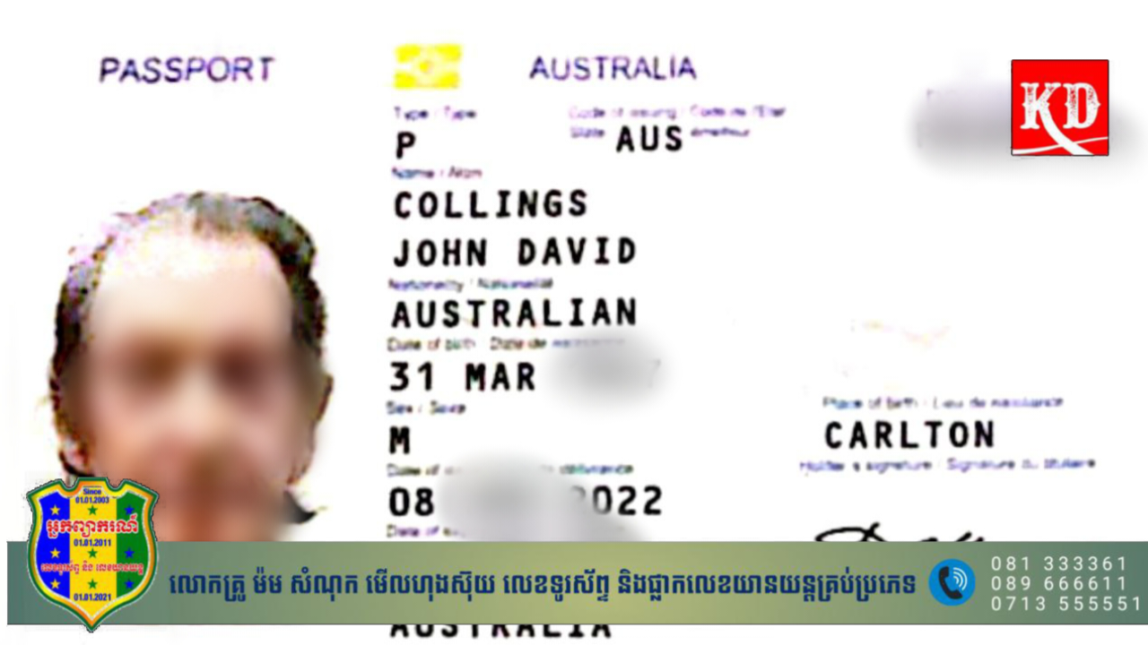 ប្រភពបានឱ្យដឹងថា សាកសពឈ្មោះ COLLINGS JOHN DAVID ភេទប្រុស អាយុ ៧៦ ឆ្នាំ មុខរបរគ្មាន កម្ពស់ ១.៦៥ម ជាជនជាតិអូស្ត្រាលី កាន់លិខិតឆ្លងដែនលេខ PB៤៨០១៤៩៤ មានទីលំនៅបណ្ដោះអាសន្នទីតាំងកើតហេតុខាង។