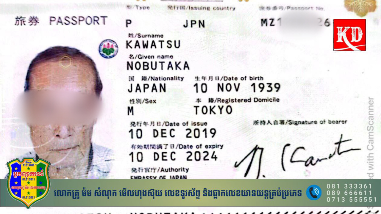 ប្រភពពីសមត្ថកិច្ចបានឲ្យដឹងថា បុរសជនជាតិជប៉ុនដែលបានស្លាប់បាត់បង់ជីវិតនោះ មានឈ្មោះ KAWATSU NOBUTAKA អាយុ ៨៤ ឆ្នាំ មុខរបរ គ្មាន កាន់លិខិតឆ្លងដែនលេខ MZ ១២៣៣៣២៦ មានទីលំនៅបណ្ដោះអាសន្ន ទីតាំងកើតហេតុខាងលើ។