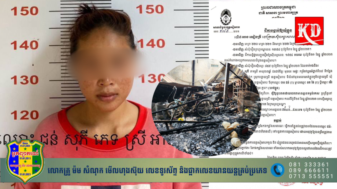 ខេត្តសៀមរាប៖ ស្ត្រីម្នាក់ប៉ុនប៉ងធ្វើអត្តឃាត ប៉ុន្តែដោយសារភ្លើងក្តៅ និងអាណិតកូនក្នុងផ្ទៃ ក៍បានគេចចេញ បណ្ដាលឱ្យឆេះផ្ទះអស់បីល្វែង ព្រោះខឹងប្ដីមិនធ្វើតាមចិត្តខ្លួន ក៍ត្រូវបានសមត្ថកិច្ចឃាត់ និង ត្រូវបានបញ្ជូនទៅឃុំខ្លួនបណ្ដោះអាសន្ន តាមអំណាចនៃដីកាបង្គាប់ឱ្យឃុំខ្លួន លេខ១៤០៤ ដ.ស.ព/ឌ របស់ចៅក្រមស៊ើបសួរ ហេង ឈៀងគ្រី ចុះថ្ងៃទី៣១ ខែធ្នូ ឆ្នាំ២០២៣។