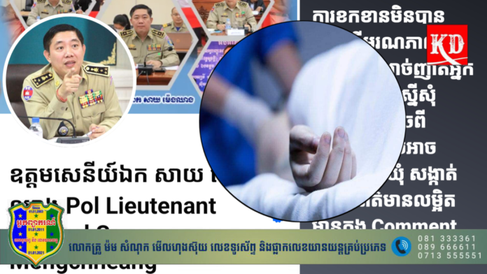 រាជធានីភ្នំពេញ៖ លោកឧត្តមសេនីយ៍ឯក សាយ ម៉េងឈៀង អគ្គនាយករង នៃអគ្គនាយកដ្ឋានអត្តសញ្ញាណកម្ម បានធ្វើការចែករំលែកព័ត៌មាននៅលើបណ្ដាញ facebook ផ្លូវការ«ឧត្តមសេនីយ៍ឯក សាយ ម៉េងឈាង Pol Lieutenant General Say Mengchheang» ថា «ការខកខានមិនបានចុះបញ្ជីមរណភាព ឆ្លងឆ្នាំអនុវត្ត សាច់ញាតិអ្នកស្លាប់ត្រូវទៅស្នើសុំសេចក្តីសម្រេចពីតុលាការ ទើបអាចចុះបញ្ជីនៅឃុំ សង្កាត់បាន»។លោកឧត្តមសេនីយ៍ឯក បន្តថា «តោះមកឈ្វេងយល់ពីការចុះសំបុត្រមរណភាពវិញម្តង។ តើការចុះសំបុត្រមរណភាពមានសារៈប្រយោជន៍អ្វីខ្លះ? ហេតុអីចាំបាច់ចុះ? នាំសាមីខ្លួនទៅទេ😁 អ្នកណាអ្នកត្រូវទៅចុះ? មានលក្ខខណ្ឌអ្វីខ្លះ? ចុះនៅទីណា? »