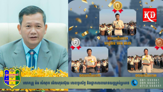 ខេត្តសៀមរាប៖ សម្តេចមហាបវរធិបតី ហ៊ុន ម៉ាណែត នាយករដ្ឋមន្ត្រីនៃព្រះរាជាណាចក្រកម្ពុជានីតិកាលទី ៧ បាន អបអរសាទរ ដល់ជយលាភីទាំង៣រូប នៃកម្មវិធីប្រឡងសរសេរតាមអានថ្នាក់ជាតិជាសាធារណៈ “សំណេរអង្គរ”។
