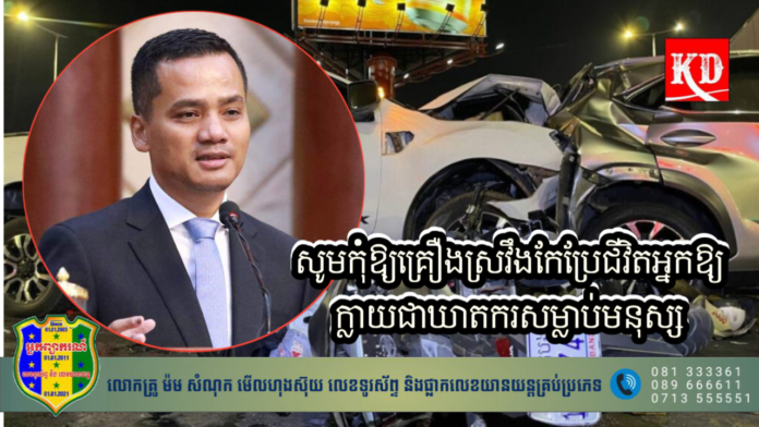 រាជធានីភ្នំពេញ៖ ឯកឧត្តមអភិសន្តិបណ្ឌិត ស សុខា ឧបនាយករដ្ឋមន្ត្រី និងជារដ្ឋមន្ត្រីក្រសួងមហាផ្ទៃ បានបង្ហោះនូវសារ លើហ្វេសប៊ុកផ្លូវការរបស់ឯកឧត្តម ថា «អ្នកនឹងក្លាយជាឃាតករ បើនៅតែបើកបរក្រោមឥទ្ធិពល នៃគ្រឿងស្រវឹង!» ឯកឧត្តមបានបញ្ជាក់ដោយសង្កត់ធ្ងន់ផងដែរថា «សូមកុំបណ្ដោយឱ្យសុរាដឹកមុខអ្នកទៅរកផ្លូវវិនាស! សូមកុំឱ្យគ្រឿងស្រវឹងកែប្រែជីវិតអ្នកឱ្យក្លាយជាឃាតករសម្លាប់មនុស្ស!»។
