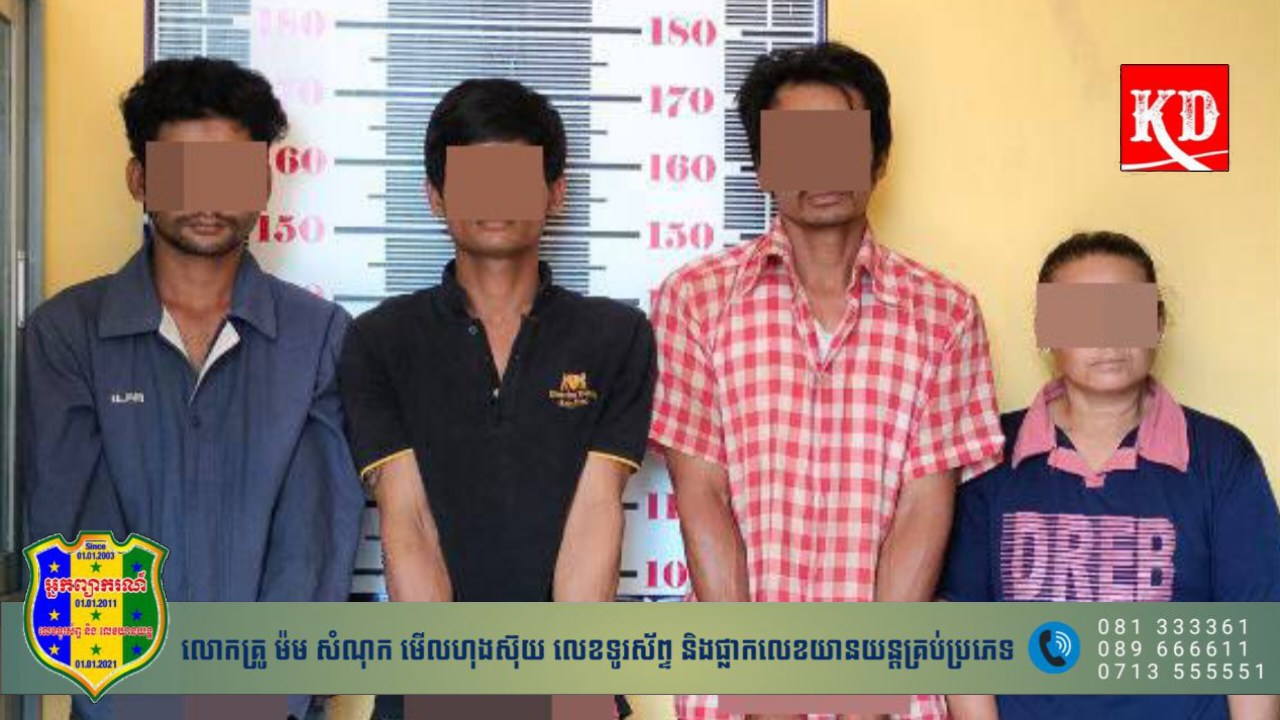ខេត្តព្រៃវែង៖ កម្លាំងការិយាល័យនគរបាលប្រឆាំងបទល្មើសគ្រឿងញៀន សហការជាមួយកម្លាំង នៃអធិការដ្ឋាននគរបាលស្រុកពារាំង ពន្លាតសមត្ថកិច្ចដែនដី សហការជាមួយកម្លាំង នៃអធិការដ្ឋាននគរបាលក្រុងអរិយក្សត្រ ធ្វើការបង្ក្រាបសំបុកក្រុមជួញដូរគ្រឿងញៀនយ៉ាងសកម្ម ធ្វើការឃាត់ខ្លួនជនសង្ស័យ ៤នាក់ រួមនិងវត្ថុតាងគ្រឿងញៀនជាច្រើនកញ្ចប់ នៅភូមិព្រៃតាទេត សង្កាត់ព្រែកលួង ក្រុងអរិយក្សត្រ ខេត្តកណ្ដាល កាលពីវេលាម៉ោង ២២ និង ៣០នាទី ថ្ងៃទី ០៤ ខែ កុម្ភៈ ឆ្នាំ ២០២៤ កន្លងទៅ។ ជនសង្ស័យ ៤នាក់ មាន ឈ្មោះ ផៃ ដារ៉ូ ភេទប្រុស អាយុ ២០ឆ្នាំ, ឈ្មោះ អ៊ិវ ប៉ូលីន ភេទប្រុស អាយុ ២៦ឆ្នាំ មុខរបរមិនពិតប្រាកដ, ឈ្មោះ ជ្រោយ វិចិត្រ ភេទប្រុស អាយុ ៤០ឆ្នាំ មុខរបរកម្មករ និងឈ្មោះ ផល ចំរើន ភេទស្រី អាយុ ៤០ឆ្នាំ មុខរបរមេផ្ទះ អ្នកទាំង ៤នាក់ រស់នៅភូមិតាជោ សង្កាត់សារិកាកែវ ក្រុងអរិយក្សត្រ ខេត្តកណ្ដាល ដោយដកហូតវត្ថុតាងរួមមាន គ្រឿងញៀន ចំនួន ៧កញ្ចប់, ទូរស័ព្ទដៃ ៣គ្រឿង, សម្ភារៈវេចខ្ចប់ និងសម្ភារៈជក់មួយចំនួនទៀត ។