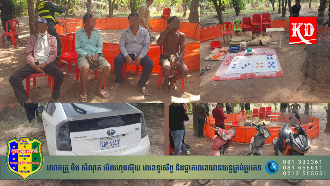 ខេត្តព្រៃវែង៖ កម្លាំងអន្តរាគមន៍ នៃស្នងការដ្ឋាននគរបាលខេត្តព្រៃវែង ចុះស្រាវជ្រាវបង្ក្រាបបទល្មើសល្បែងស៊ីសងខុសច្បាប់ (ប្រជល់មាន់លើដី) ឃាត់បានមនុស្សចំនួន ៥នាក់ រួមនិងវត្ថុតាងមាន់ជល់ និងឧបករណ៍សម្ភារៈលេងល្បែងជាច្រើន បញ្ជូនមកស្នងការដ្ឋានគរបាលខេត្តព្រៃវែង នៅចំណុចចម្ការស្វាយមួយកន្លែង ស្ថិតនៅភូមិស្វាយសាក់ ឃុំពោធិ៍ទី ស្រុកស៊ីធរកណ្ដាល ខេត្តព្រៃវែង កាលពីវេលាម៉ោង ១៣ និង ១៥នាទីថ្ងៃទី ០៤ ខែ កុម្ភៈ ឆ្នាំ ២០២៤កន្លងទៅ។