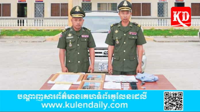 ខេត្តបាត់ដំបង៖ អនុវត្តបទបញ្ជាលោកឧត្តមសេនីយ៍ត្រី ហែម វុទ្ធី មេបញ្ជាការកងរាជអាវុធហត្ថខេត្តបាត់ដំបង និងដោយមានការសម្របសម្រួលនីតិវិធីពី ឯកឧត្តម កែវ សុជាតិ ព្រះរាជអាជ្ញា នៃអយ្យការអមសាលាដំបូងខេត្តបាត់ដំបង នៅវេលាម៉ោង ១១ និង ១៥នាទី ថ្ងៃទី១៨ ខែមីនា ឆ្នាំ២០២៤ លោកវរសេនីយ៍ឯក ហួត សុភាព មេបញ្ជាការរងទទួលការងារស្រាវជ្រាវព័ត៌មានសន្ដិសុខ កងរាជអាវុធហត្ថខេត្តបាត់ដំបង បានដឹកនាំកម្លាំងចុះបង្រ្កាបករណីប្រើប្រាស់ឯកសណ្ឋាន និងក្លែងបន្លំឯកសារកងទ័ព ស្ថិតភូមិព្រៃសង្ហា ឃុំខ្នាចរមាស ស្រុកបវេល ខេត្តបាត់ដំបង។