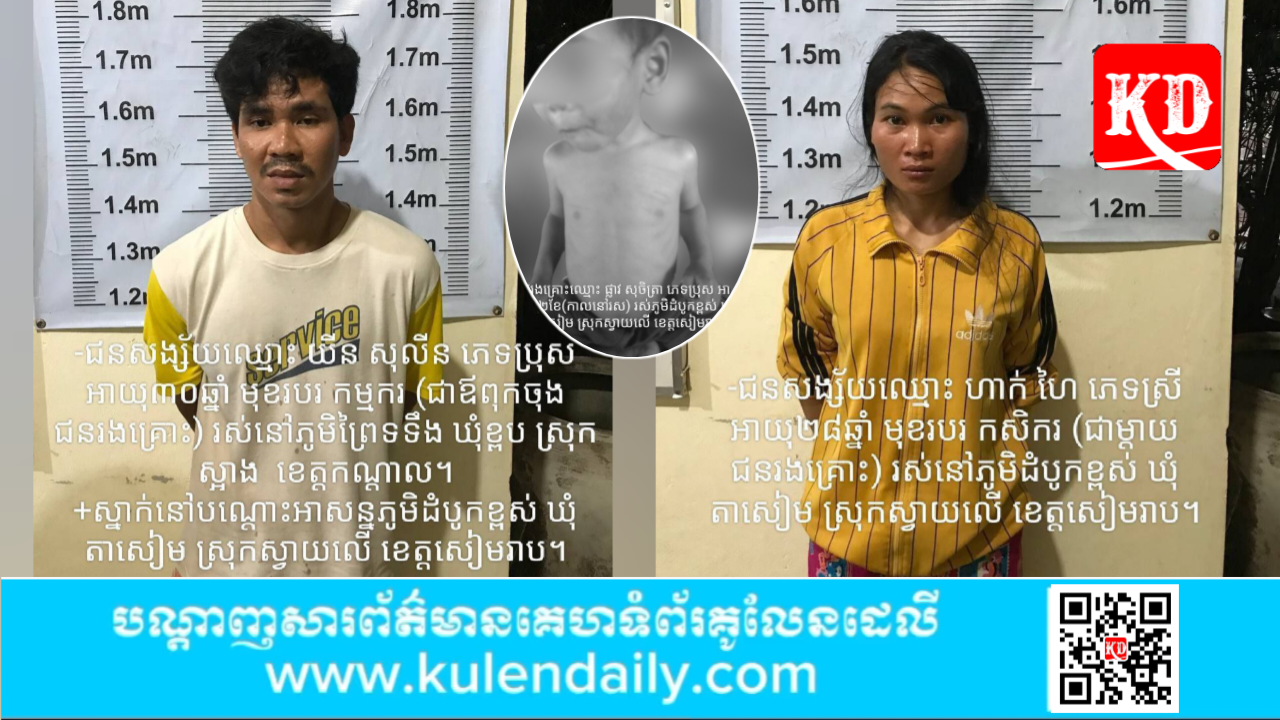 ខេត្តសៀមរាប៖ កំសត់ពេកហើយក្មេងប្រុសម្នាក់មានអាយុទើបតែ ២២ខែប៉ុណ្ណោះ ត្រូវបានម្ដាយបង្កើតតែងតែធ្វើទារុណកម្ម និងមកដល់ជីវិតចុងក្រោយត្រូវឪពុកចុង វាយធ្វើបាបរហូតដល់ស្លាប់បាត់បង់ជីវិតយ៉ាងខ្លោចផ្សា រីឯម្ដាយចិត្តអប្រិយបានត្រឹមឈរមើល នៅផ្ទះស្នាក់បណ្ដោះអាសន្ន ក្នុងភូមិដំបូកខ្ពស់ ឃុំតាសៀម ស្រុកស្វាយលើ ខេត្តសៀមរាបកាលពីវេលាម៉ោង ២០ និង ០០នាទីថ្ងៃទី ២១ ខែមីនា ឆ្នាំ២០២៤កន្លងទៅ។