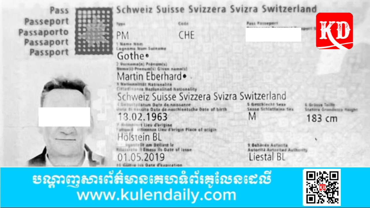 ប្រភពពីសមត្ថកិច្ចបានឲ្យដឹងថា ជនជាតិ ស្វីស ដែលបានស្លាប់បាត់បង់ជីវិតនោះមានឈ្មោះ GOTHE MARTIN EBERHARD ភេទប្រុស អាយុ ៦១ឆ្នាំ មុខរបរ គ្មាន កាន់លិខិតឆ្លងដែនលេខ X៩០៧៥០០៣ ស្នាក់នៅបណ្ដោះអាសន្ន ទីតាំងកើតហេតុខាងលើ។