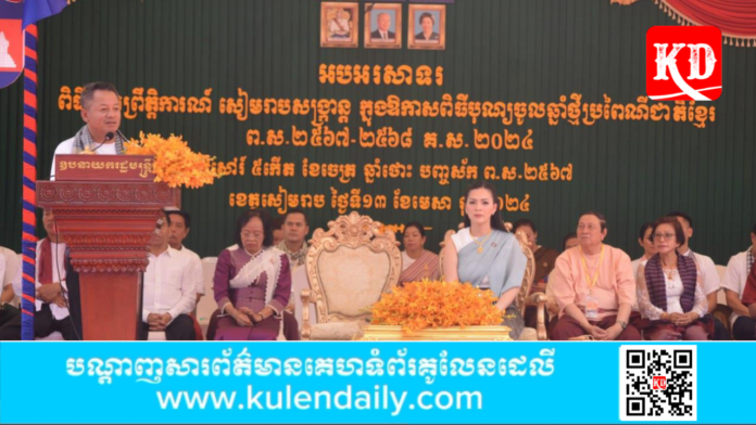 ខេត្តសៀមរាប៖ ឯកឧត្តម ទៀ សីហា ឧបនាយករដ្ឋមន្ត្រី រដ្ឋមន្ត្រីក្រសួងការពារជាតិ និងលោកជំទាវ បានអញ្ជើញជាអធិបតីភាព ក្នុងការបើកព្រឹត្តិការណ៍ «សៀមរាបសង្ក្រាន្ត» ឆ្នាំ២០២៤ ដើម្បីអបអរសាទរពិធីបុណ្យចូលឆ្នាំថ្មីប្រពៃណីខ្មែរ នាបរិវេណព្រះរាជដំណាក់ ក្រុងសៀមរាប ដោយមានវត្តមាន ឯកឧត្តម ប្រាក់ សោភ័ណ អភិបាលខេត្តសៀមរាប អភិបាលខេត្តរង ក្រុមប្រឹក្សាខេត្ត ព្រមទាំងថ្នាក់ដឹកនាំ មន្ត្រីរាជការ អង្គភាព ស្ថាប័នពាក់ព័ន្ធ អាជ្ញាធរជាតិអប្សរា យុវជន ស.ស.យ.ក ព្រមទាំងវិស័យឯកជន និងប្រជាពលរដ្ឋ ភ្ញៀវជាតិ-អន្តរជាតិ ប្រមាណជា ៥០០នាក់ ផងដែរ នៅព្រឹកថ្ងៃសៅរ៍ ទី១៣ ខែមេសា ឆ្នាំ២០២៤នេះ ។