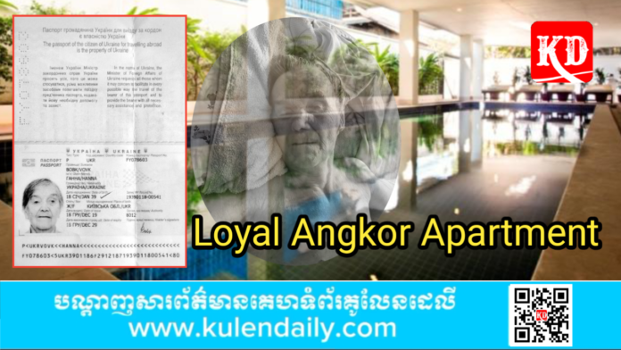 ខេត្តសៀមរាប៖ ជនជាតិ អ៊ុយក្រែន ម្នាក់មានឈ្មោះ BOBK/VOVK AHHA HANNA ភេទស្រី អាយុ ៨៥ឆ្នាំ កាន់លិខិតឆ្លងដែនលេខ FY០៧៨៦០៣ មុខរបរ គ្មាន បានស្លាប់ក្នុង អាផាតាមិន ឡូយ៉ាល់ អង្គរ ( Loyal Angkor Apartment ) ដែលស្ថិតនៅភូមិទ្រាំង សង្កាត់ស្លក្រាម ក្រុងសៀមរាប ខេត្តសៀមរាប វេលាម៉ោង ០៨ និង ០០នាទីថ្ងៃទី២៣ ខែមេសា ឆ្នាំ២០២៤។ នេះបើយោងតាមការឲ្យដឹងពីសមត្ថកិច្ច មកកាន់ទីភ្នាក់ងារសារព័ត៌មានគូលែនដេលី នៅរសៀលថ្ងៃដដែល។