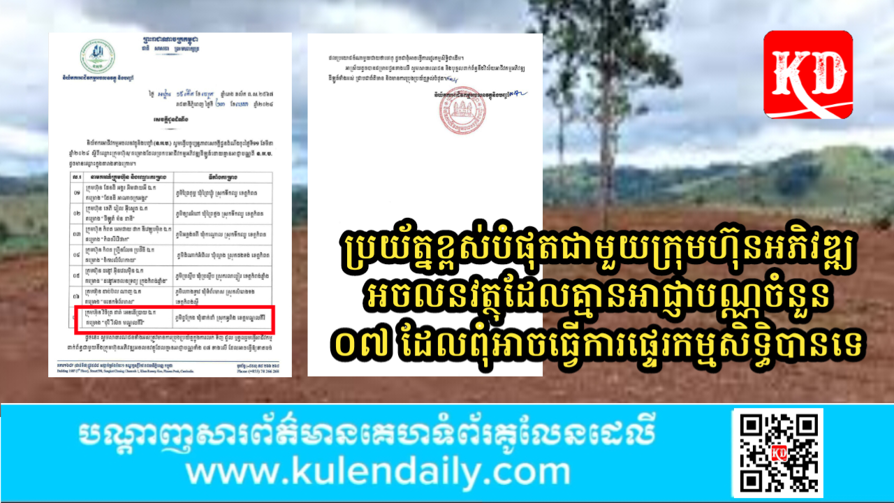 រាជធានីភ្នំពេញ៖ កាលពីថ្ងៃទី ២៣ ខែមេសា ឆ្នាំ ២០២៤កន្លងទៅនេះ និយ័តករអាជីវកម្មអចលនវត្ថុនិងបញ្ចាំ(ន.អ.ប.) ចេញនូវសេចក្តីជូនដំណឹង ពីការធ្វើបច្ចុប្បន្នភាពសេចក្តីជូនដំណឹងចុះថ្ងៃទី១១ ខែមីនា ឆ្នាំ២០២៤ ស្តីពីឈ្មោះក្រុមហ៊ុន/គម្រោងដែលប្រកបអាជីវកម្មអភិវឌ្ឍដីឡូត៍ដោយគ្មានអាជ្ញាបណ្ណពី ន.អ.ប.ចំនួន៧ដូចជា៖