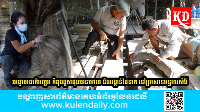 ខេត្តសៀមរាប៖ ក្រុមអ្នកបច្ចេកទេសរបស់នាយកដ្ឋានអភិរក្សប្រាសាទ និងបុរាណវិទ្យា នៃអាជ្ញាធរជាតិអប្សរា កំពុងចាប់ផ្ដើមជួសជុលរានហាល និងបង្កាន់ដៃនាគ នៅប៉ែកខាងកើតនៃជ្រុងខាងលិចឆៀងខាងជើងរបស់ប្រាសាទបន្ទាយសំរ៉ែ។