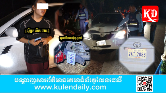 នៅរសៀលថ្ងៃដដែលនេះ លោកវរសេនីយ៍ឯក លឹម សម្បត្តិ អធិការ នៃអធិការដ្ឋាននគរបាលស្រុកប្រាសាទបាគង បានប្រាប់មកកាន់អង្គភាពសារព័ត៌មានគូលែនដេលី ថាកាលពីវេលាម៉ោង 20 និង 18 នាទី ថ្ងៃទី ១៩ ខែឧសភា ឆ្នាំ២០២៤ កន្លងទៅ មានករណីគ្រោះថ្នាក់ចរាចរណ៍ នៅលើផ្លវជាតិ 6 ចំណុចចន្លោះបង្គោលគីឡូលេខ 301-302 ស្ថិតក្នុងភូមិលលៃ ឃុំបាគង ស្រុកប្រាសាទបាគង ខេត្តសៀមរាប ដោយរថយន្ត១គ្រឿងម៉ាក Toyota CAMERY Hybrid ពណ៌ស ពាក់ផ្លាកលេខ ភ្នំពេញ 2AT-2086 បើកបរដោយឈ្មោះ រ៉េន ចន្ធា ភេទស្រី អាយុ 26 ឆ្នាំ នៅភូមិប្រាំមួយ ឃុំតាក្រី ស្រុកកំរៀង ខេត្តបាត់ដំបង បើកបរមានទិសដៅពីកើតទៅលិច បុកម៉ូតូ១គ្រឿងម៉ាកហុងដាទ្រីម សេ125 (017) ពណ៍ខ្មៅ ពាក់ផ្លាកលេខ សៀមរាប 1W-9824 បើកបរដោយឈ្មោះ សុខ វាសនា ភេទប្រុស អាយុ ២៥ឆ្នាំ រស់នៅភូមិស្ពានក្អែក ឃុំកណ្តែក ស្រុកប្រាសាទបាគង ខេត្តសៀមរាប បើកបរមានទិសដៅពីលិចទៅកើត(អត់ពាក់មួកសុខវត្តិភាព)។