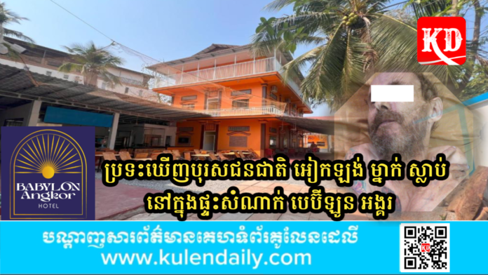ខេត្តសៀមរាប៖ បុរសជនជាតិ អៀកឡង់ ម្នាក់ ត្រូវបានប្រទះឃើញ ស្លាប់ នៅក្នុងបន្ទប់លេខ ១០៨ ជាន់ផ្ទាល់ដី នៃផ្ទះសំណាក់ បេប៊ីឡូន អង្គរ BABY LON ANGKOR ដែលស្ថិតនៅភូមិស្ទឹងថ្មី សង្កាត់ស្វាយដង្គំ ក្រុងសៀមរាប ខេត្តសៀមរាប នៅវេលាម៉ោង ៩ និង ០០ នាទី ថ្ងៃទី ២១ ខែ ឧសភា ឆ្នាំ២០២៤។