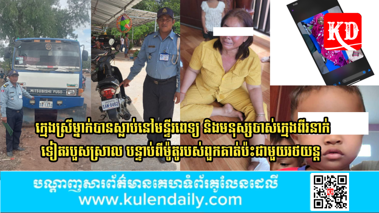 ខេត្តសៀមរាប៖ ក្មេងស្រីម្នាក់បានស្លាប់បាត់បង់ជីវិត ក្រោយពីបញ្ជូនទៅដល់មន្ទីរពេទ្យ និងមនុស្សចាស់ក្មេង ពីរនាក់ទៀត រងរបួសស្រាល បន្ទាប់ពីម៉ូតូរបស់ពួកគាត់ប៉ះជាមួយនឹងរថយន្ត លើផ្លវជាតិ 6 ត្រង់ចន្លោះបង្គោលគីឡូលេខ 306 និង 307 ចំណុចមុខផ្លូវចូលស្តាតថ្មី ស្ថិតក្នុងភូមិគោកត្នោត ឃុំកណ្ដែក ស្រុកប្រាសាទបាគង ខេត្តសៀមរាប វេលាម៉ោង 8 និង 30នាទី ថ្ងៃទី 22 ខែ ឧសភា ឆ្នាំ2024។